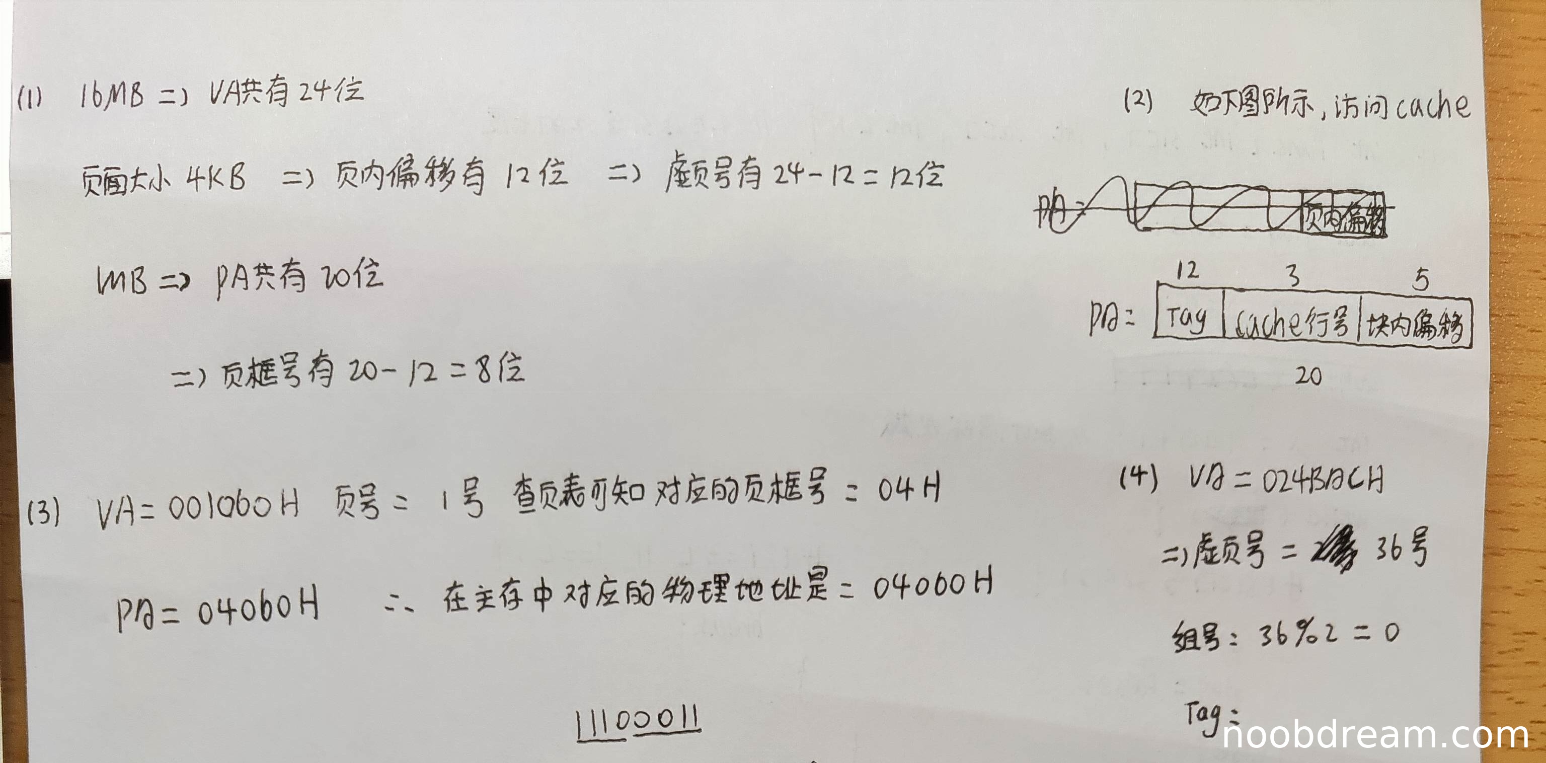 学生答案中虚拟地址写为024B0CH(应为024BACH),判断为识别错误,不扣分。但仅计算了组号和虚页号,未结合TLB内容进行分析,也未给出是否在主存中的结论和理由,回答不完整,扣2分。得0分。