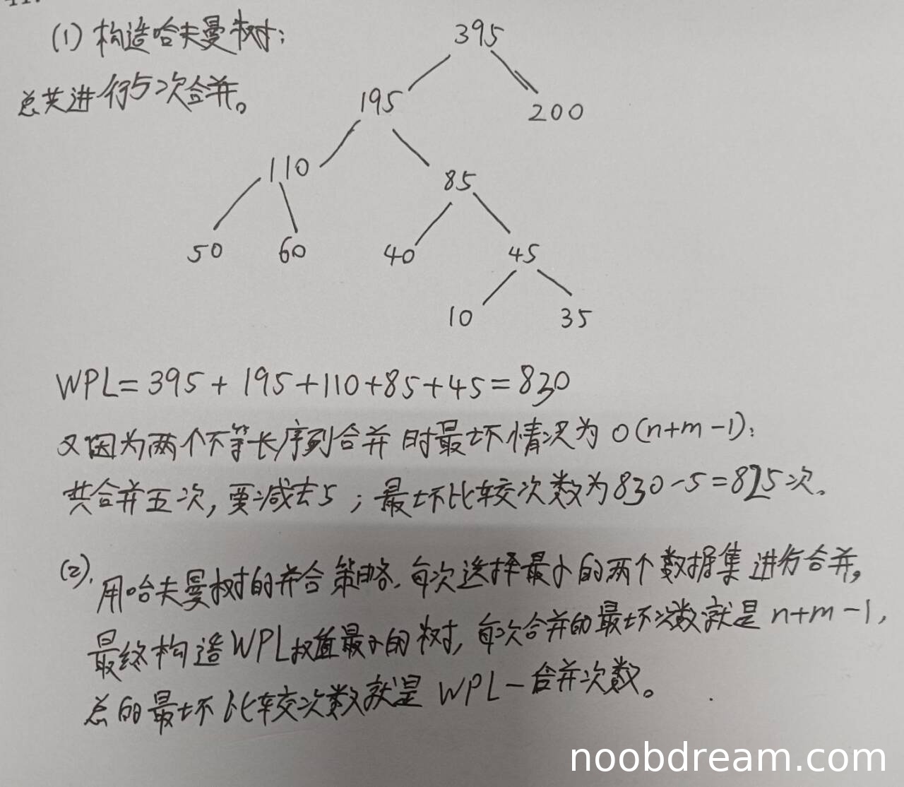 学生正确使用了哈夫曼树(最佳归并树)的思想进行合并,并给出了最终的总比较次数825次,与标准答案一致。但在合并过程的描述上,学生没有像标准答案那样详细列出每一步合并的表和生成的中间表,而是直接计算了WPL并减去合并次数得到总比较次数。根据标准答案的评分说明,对于用类似哈夫曼树思想进行合并,过程描述正确给5分,正确算出总比较次数给2分。由于学生没有完整描述合并过程(例如没有明确写出每次合并的具体表),但计算方法和结果正确,因此扣1分。得分:5(过程)+2(计算)=7分,但过程描述不完整扣1分,最终得6分。