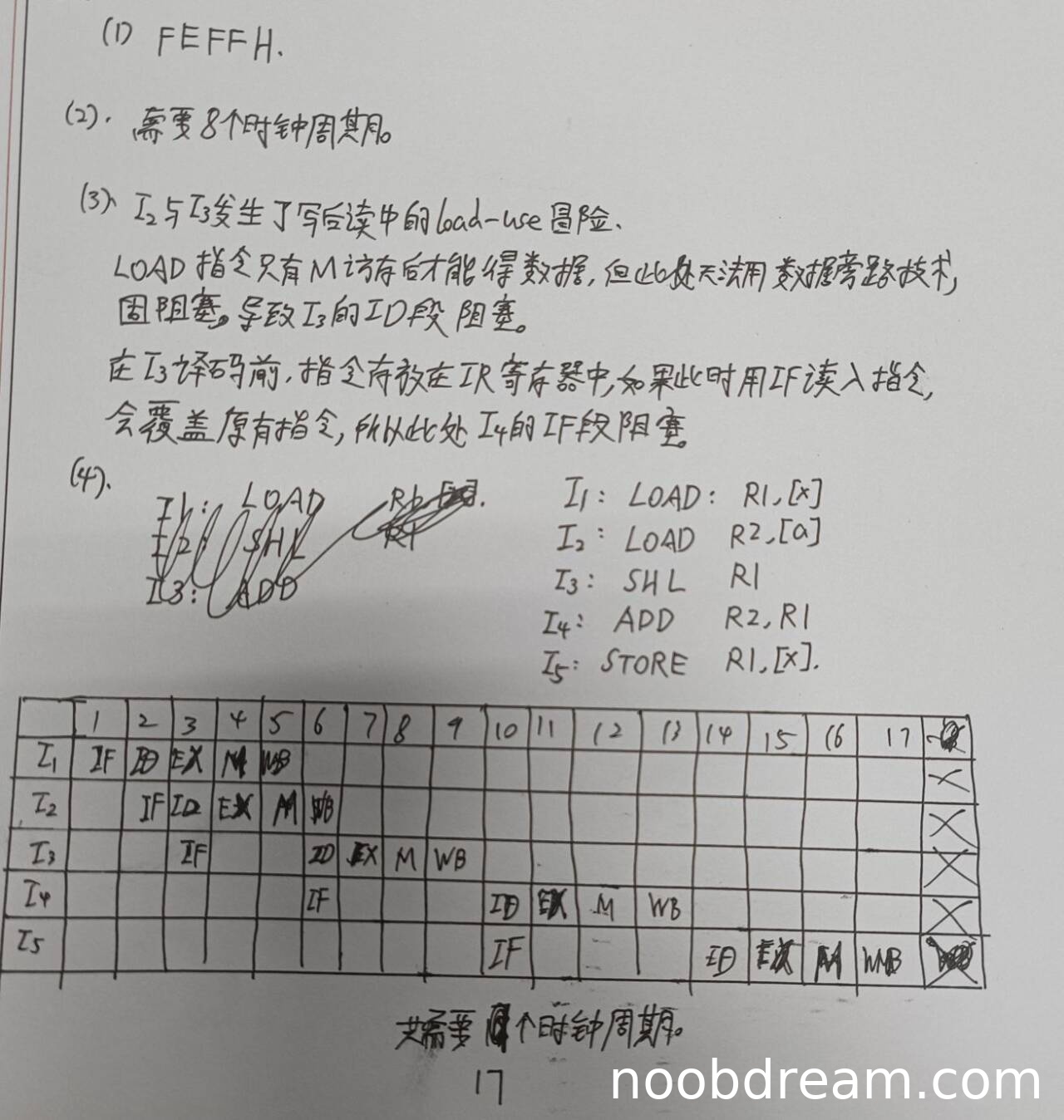 流水线执行过程图学生基本正确绘制,显示了必要的阻塞周期,与标准答案的流水线时序一致。但受指令序列错误影响,图表中的操作数依赖关系可能不准确。考虑到图表本身绘制正确,给3分。