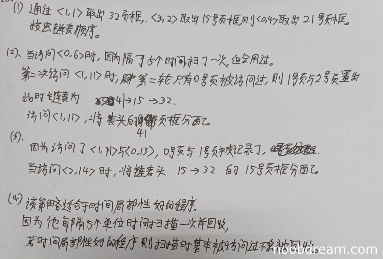 学生答案给出的页框号是41(第一次识别)或15(第二次识别),但标准答案是32。虽然学生识别出页1在第二轮扫描后被回收,但在重新分配时错误选择了链表头部页框而非实际应被重新使用的页框。理由部分存在逻辑错误,扣1分。得1分。