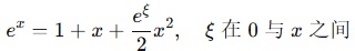 标准答案:\(\mathrm{e}^{x}=1 + x + \frac{\mathrm{e}^{\xi}}{2}x^{2}\),\(\xi\)介于\(0\),\(x\)之间