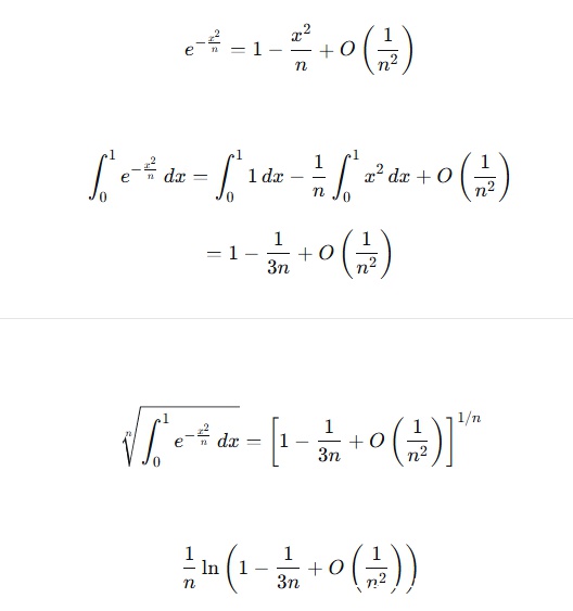 理由:学生直接给出结果"原极限=e^0=1",但完全没有展示计算过程。题目要求计算极限\(\lim\limits_{n\to\infty}\sqrt[n]{\int_{0}^{1}\mathrm{e}^{-\frac{x^{2}}{n}}\mathrm{d}x}\),这是一个需要详细推导的过程。学生没有使用第(1)问的麦克劳林公式,也没有展示任何积分计算步骤,直接跳跃到最终答案,属于严重的逻辑缺失。虽然最终答案正确,但缺乏必要的推导过程,不能得分。