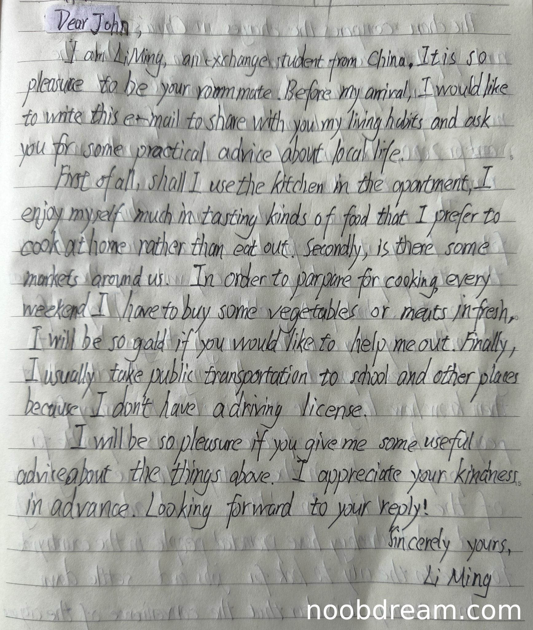 - 内容完整性:作文内容完整,覆盖了所有要点:自我介绍、生活习惯分享(使用厨房、购物需求、公共交通)、请求建议,以及礼貌结尾。但"meats in fresh"应为"fresh meats",存在次要要点表达不够准确的问题。