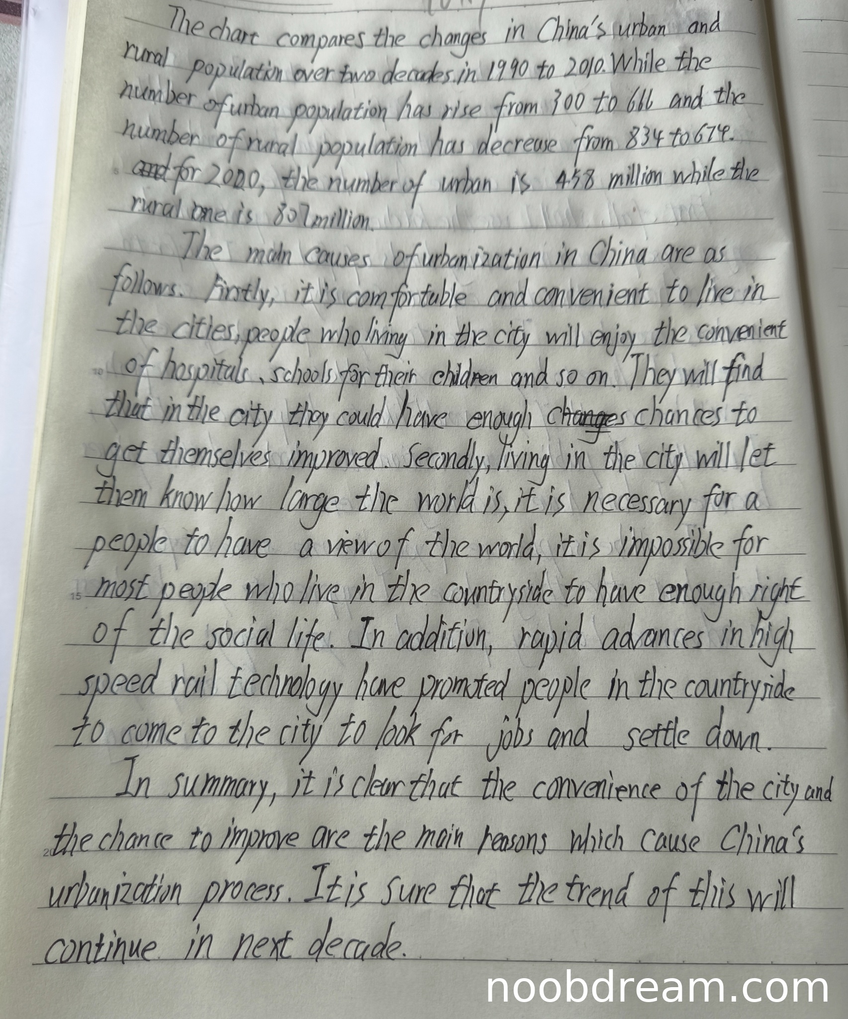 理由:作文基本完成了图表描述任务,包含了城乡人口变化趋势(城市人口上升、农村人口下降),但数据描述存在明显错误。第一次识别中2020年数据(城市458百万,农村807百万)与图表实际数据不符(应为城市666百万,农村674百万),这属于内容要点偏差。不过考虑到可能是识别错误,根据规则不扣分。原因分析部分涵盖了城市便利性、发展机会和交通改善等合理要点。