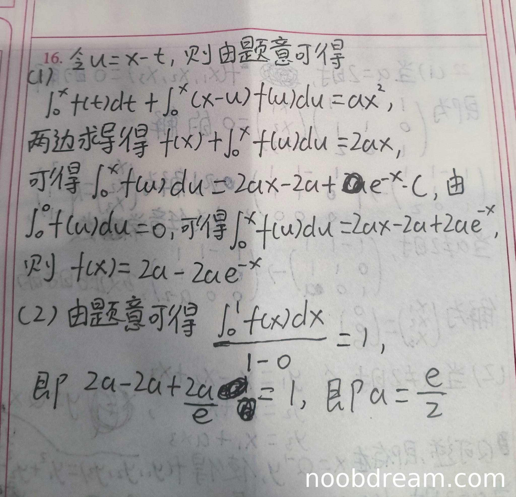 学生作答中,第一部分求解f(x)的过程存在逻辑错误。在变量替换后,得到方程∫₀ˣ f(t)dt + x∫₀ˣ f(u)du - ∫₀ˣ uf(u)du = ax²,然后两边求导得到f(x) + ∫₀ˣ f(u)du = 2ax,这一步是正确的。但在求解微分方程时,学生直接写出了∫₀ˣ f(u)du的表达式,而没有通过求解微分方程f'(x)+f(x)=2a来得到f(x)。学生的最终结果f(x)=2a-2ae⁻ˣ与标准答案f(x)=2a(1-e⁻ˣ)在形式上等价,但推导过程不完整且存在跳跃。考虑到结果正确但推导过程有缺陷,扣2分,得3分。