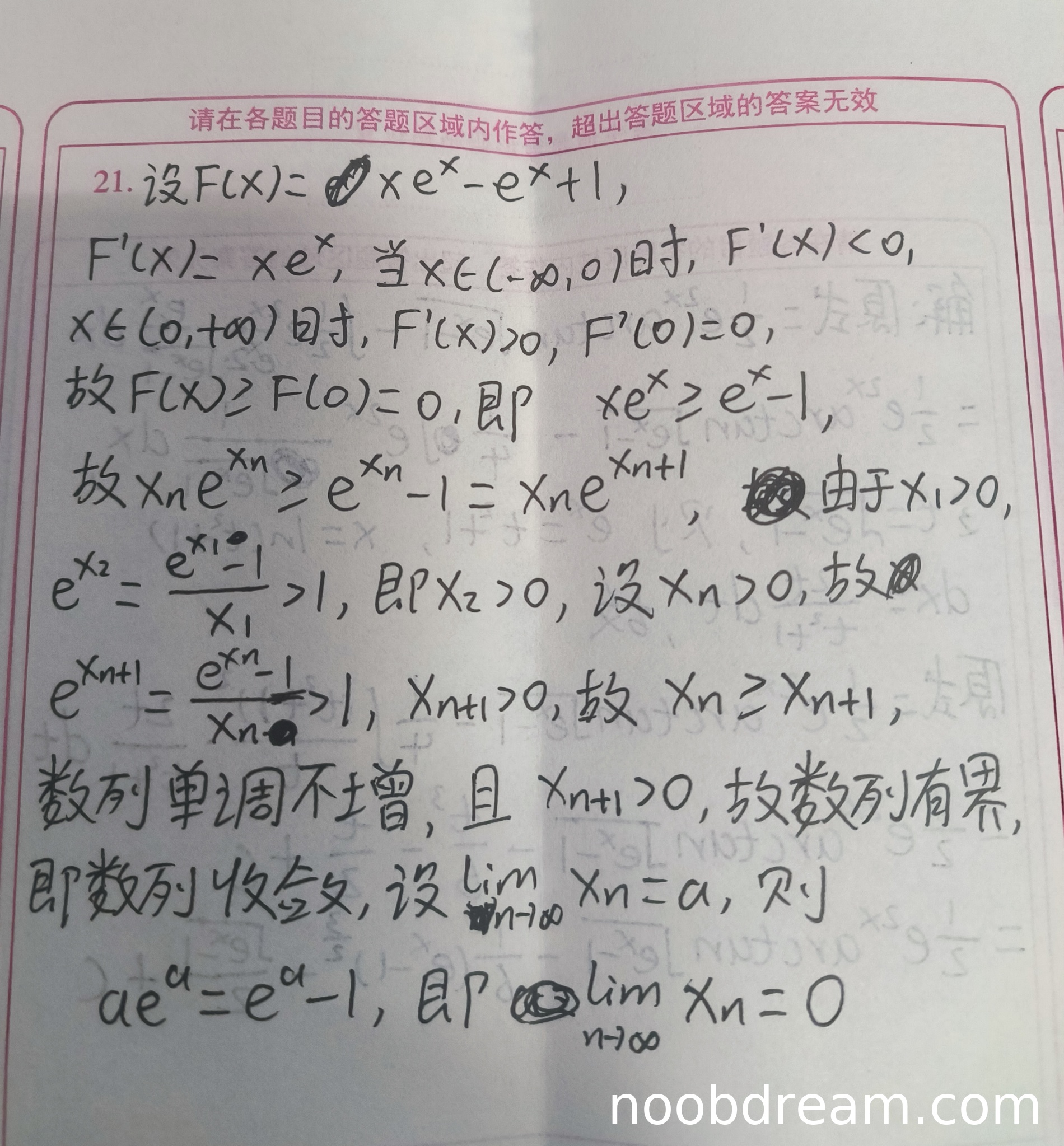 - 扣分:在证明单调性时,从x_ne^{x_n}≥e^{x_n}-1=x_ne^{x_{n+1}}直接推出x_n≥x_{n+1}的逻辑不够严谨。应该是x_ne^{x_n}≥x_ne^{x_{n+1}},由于x_n>0,所以e^{x_n}≥e^{x_{n+1}},从而x_n≥x_{n+1}。学生省略了关键步骤(-2分)