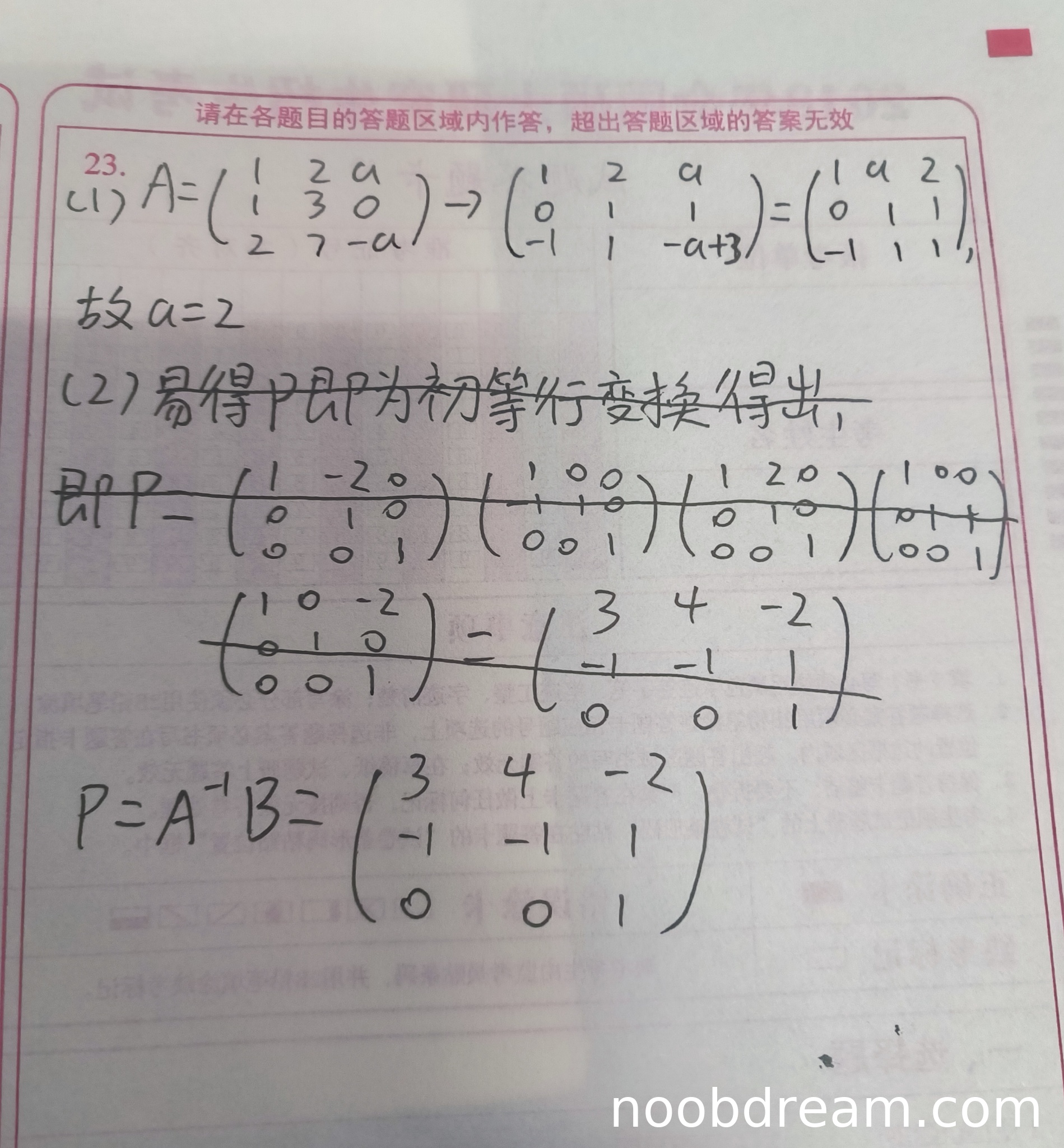 第1次识别结果:学生直接给出P=A⁻¹B的具体矩阵,但未说明理由。第2次识别结果:学生通过初等矩阵乘积的方式得到P,但给出的初等矩阵乘积计算复杂且未验证可逆性。主要问题:学生只给出了一个特定的P,而题目要求的是"所有满足条件的可逆矩阵P"。这是一个严重的逻辑错误,因为题目要求的是通解形式。扣3分,得2.5分。