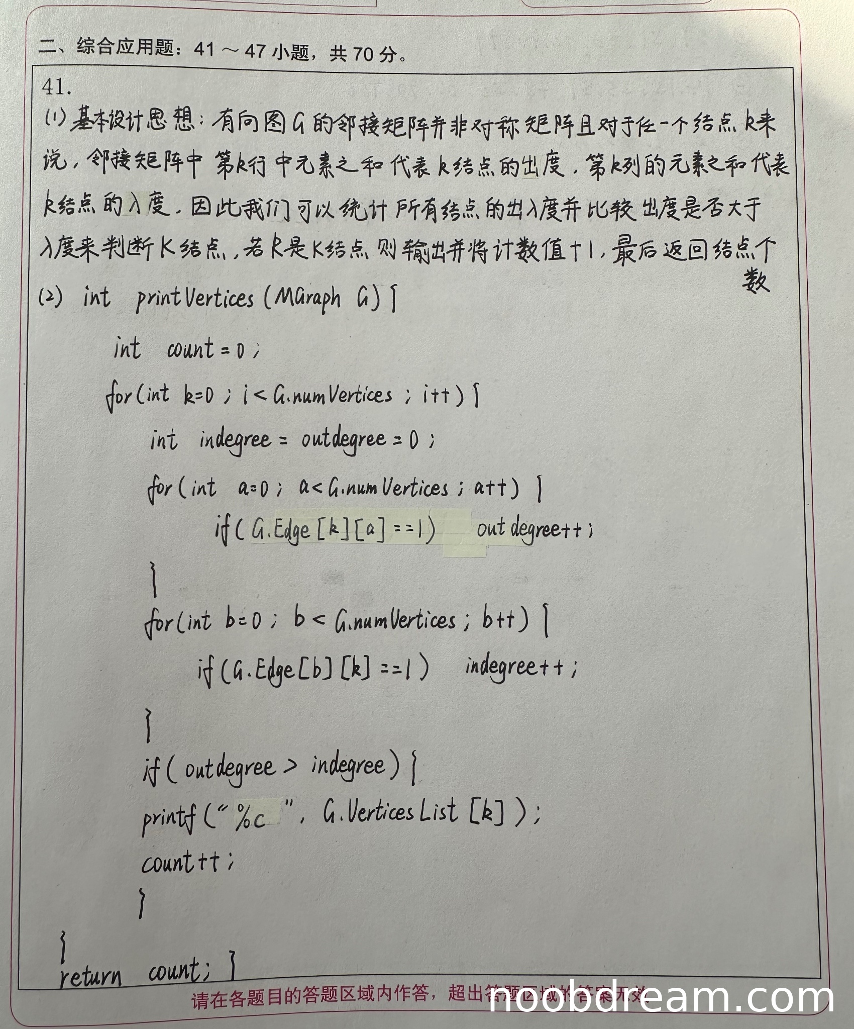 1. 变量声明错误:int indegree = outdegree = 0; 在C语言中不能连续赋值,应分开写为 int indegree = 0, outdegree = 0;。但考虑到可能是识别错误或笔误,且不影响核心逻辑,不扣分。