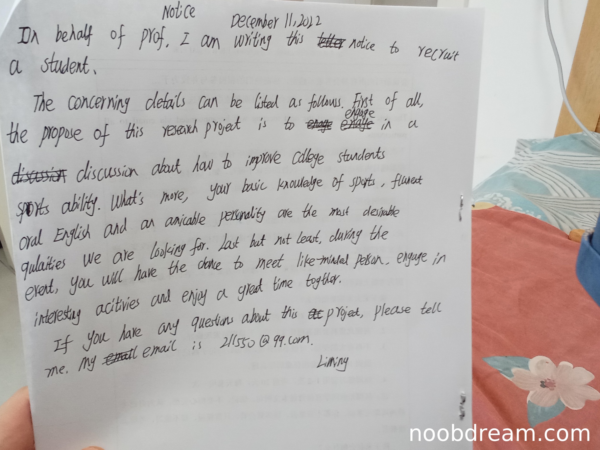 理由:通知基本格式正确(有标题、日期、落款),但语域不够恰当。通知中使用了"please tell me"等口语化表达,不符合正式通知的语体要求。落款"Liming"应为"Li Ming"。