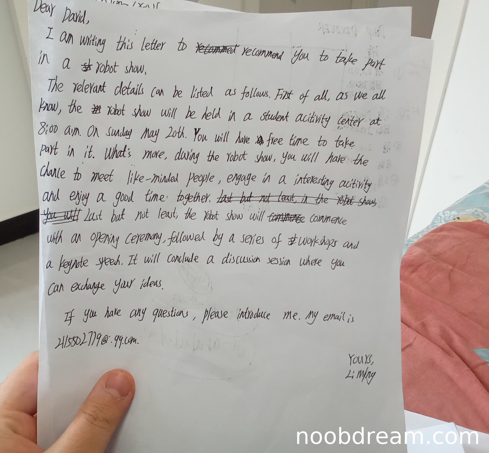 学生明确建议参加机器人展(make a suggestion),并提供了多个理由(give your reason(s)),如时间地点、社交机会、活动流程等。但部分理由(如具体日期5月20日、开幕式等)属于冗余细节,未紧扣"推荐理由"的核心要求,存在次要要点偏离。内容整体完整但不够精炼。