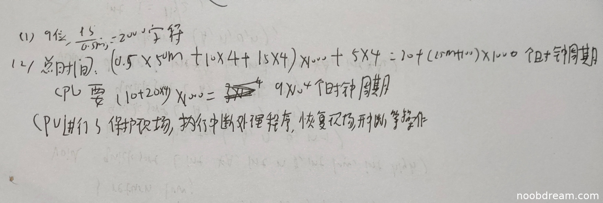 第一小问计算完成1000个字符所需总时间:学生表达式为(0.5×50m + 10×4 + 15×4)×1000 + 5×4,其中"0.5×50m"应为0.5ms对应时钟周期数,正确计算应为0.5ms/(1/50MHz)=25000时钟周期,但学生写成0.5×50m(可能意为0.5×50×10^6=25×10^6),这是明显计算错误。但后续中断响应10×4和中断服务前15条指令15×4计算正确。最终结果表达式混乱,存在逻辑错误。根据评分说明,若答案为25000000左右可给2分,学生答案不符合要求,此部分得0分。