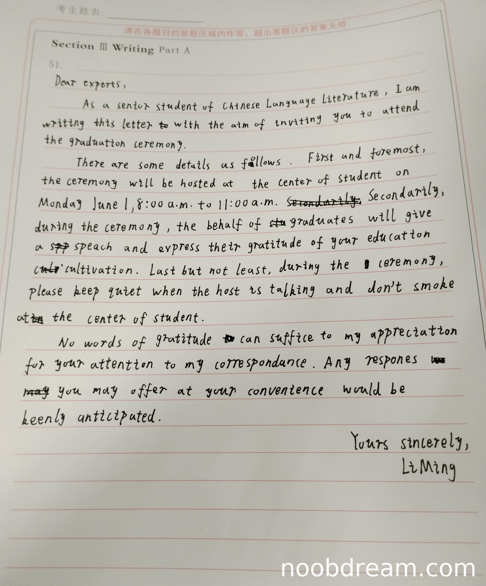 理由:内容基本完整,包含了时间(Monday, June 1, 8:00 a.m. to 11:00 a.m.)和地点(center of student)等关键信息,但"其他相关信息"部分存在不足。邀请对象是"international experts",但文中以"senior student"身份发出邀请不够正式,且包含了对专家的行为要求(keep quiet, don't smoke),这在邀请函中显得不够得体,影响了内容的恰当性。