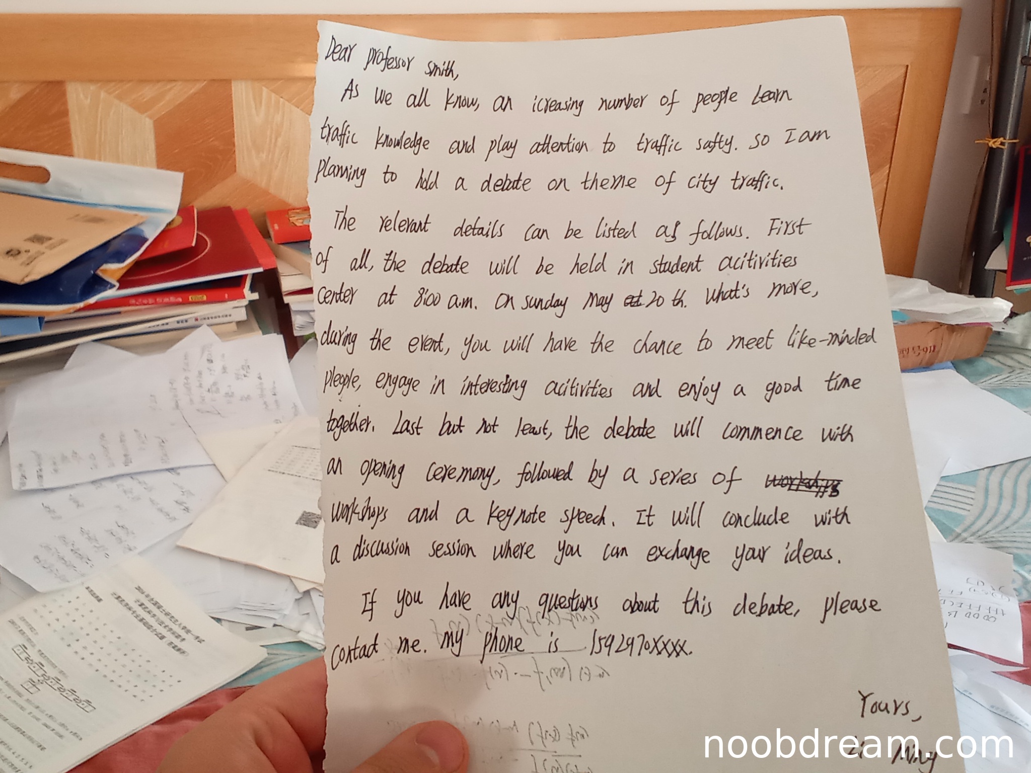 理由:邮件格式基本正确,有称呼、正文、落款。但语域存在问题:1)对教授使用"you will have the chance"等表达不够正式;2)活动安排描述过于笼统,缺乏学术辩论应有的严谨性;3)电话号码格式不规范。整体语域偏向活动通知而非学术建议。