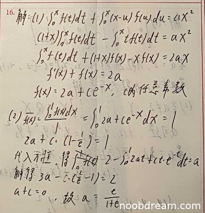 学生作答中,第一部分求解f(x)的过程基本正确。首先通过变量代换将第二个积分转化为x∫₀ˣf(u)du - ∫₀ˣuf(u)du,然后得到方程∫₀ˣf(t)dt + x∫₀ˣf(u)du - ∫₀ˣuf(u)du = ax²。接着对x求导得到f(x) + ∫₀ˣf(u)du = 2ax,再求导得到f'(x) + f(x) = 2a,并正确解出f(x) = 2a + ce⁻ˣ。