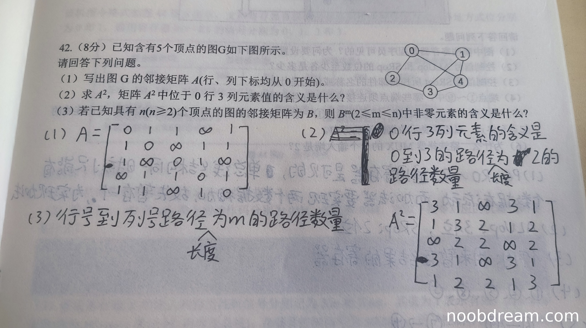 学生第二次识别结果给出了A²矩阵,但其中包含∞符号,计算不完整。不过学生对0行3列元素含义的解释正确,准确指出了"0到3的路径长度为2的路径数量"。由于计算部分有缺陷但含义解释正确,扣1分。