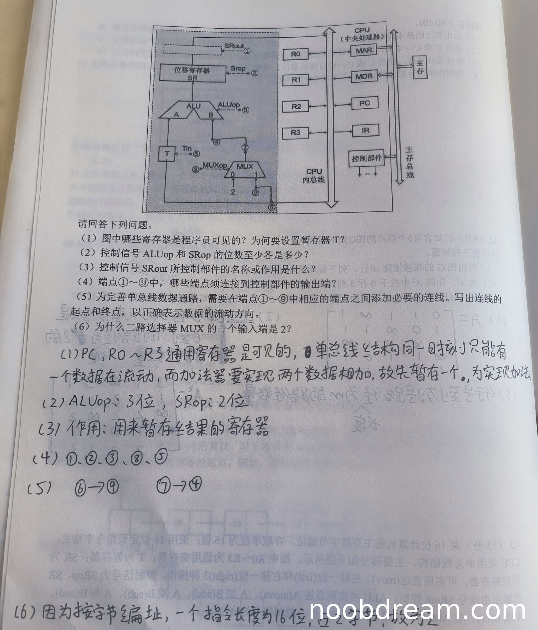 学生答案"用来暂存结果的寄存器"错误。SRout控制的是三态门,用于控制移位寄存器与总线之间的连接与断开,不是暂存结果的寄存器。得0分。