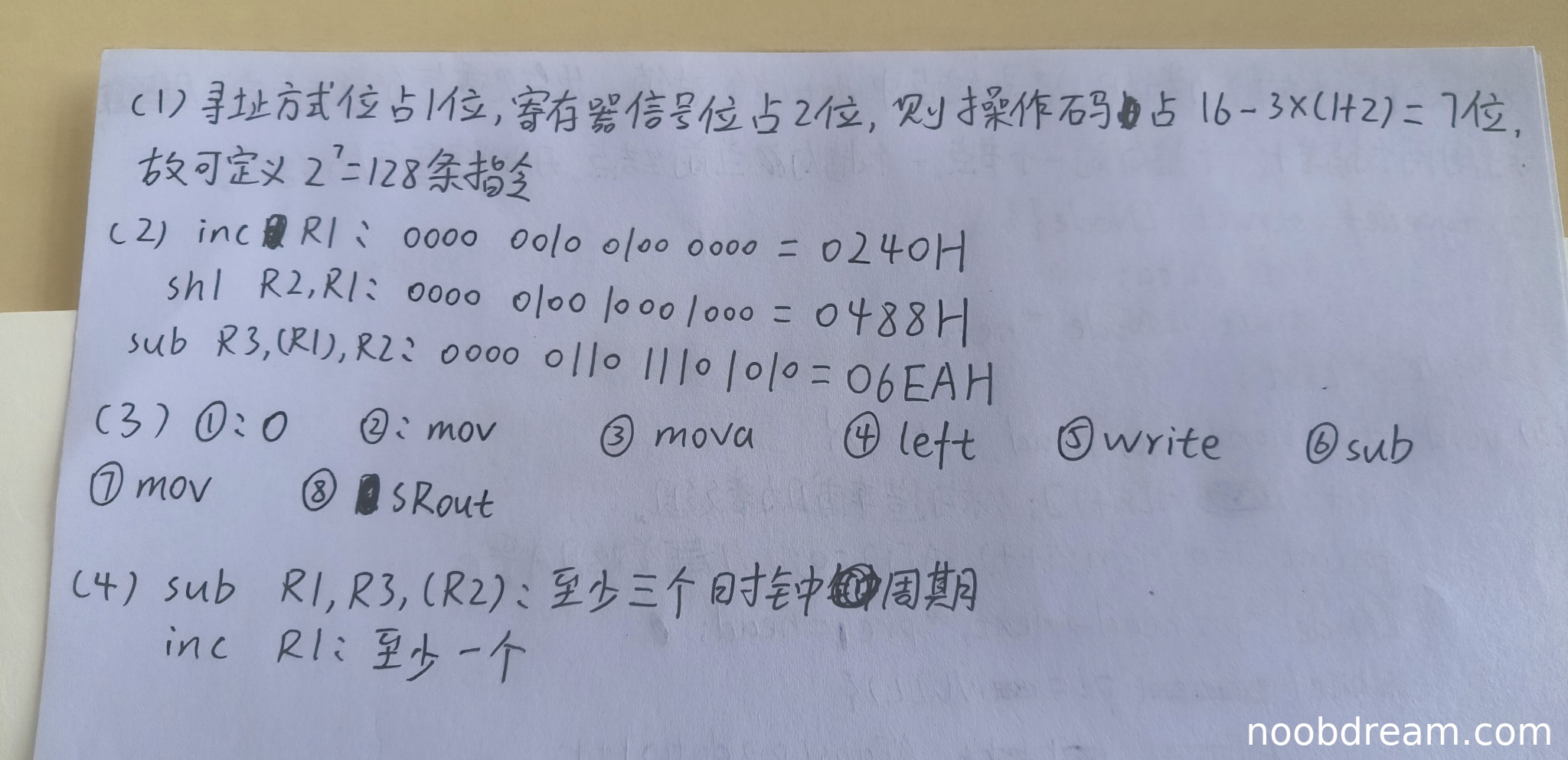 学生正确计算了三条指令的机器码:inc R1为0240H,shl R2,R1为0488H,sub R3,(R1),R2为06EAH,与标准答案完全一致。得3分。