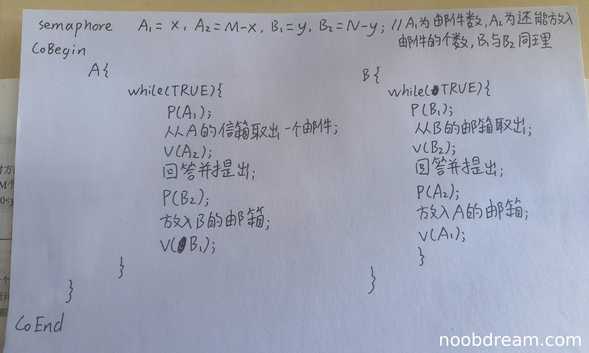 理由:学生定义了四个信号量A1、A2、B1、B2,分别对应A信箱邮件数、A信箱剩余空间、B信箱邮件数、B信箱剩余空间,初值设置正确(x, M-x, y, N-y)。虽然命名与标准答案不同,但含义清晰正确,不扣分。