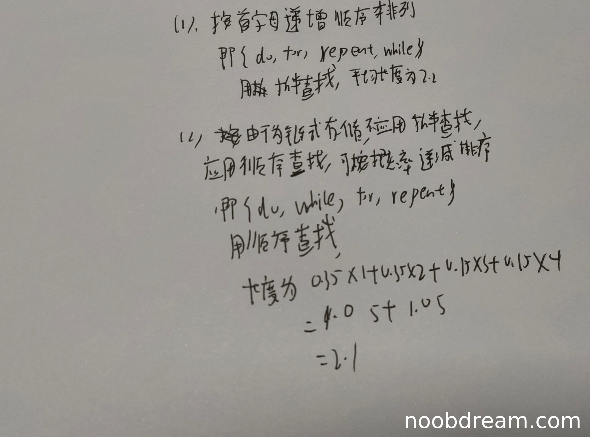 学生答案中,对于链式存储结构,提出按概率递减排序(即降序排列)并使用顺序查找,平均查找长度计算为2.1。这与标准答案中的答案一完全一致,元素排列正确、查找方法正确、平均查找长度计算正确。虽然学生第一次识别中写成了“repent”(应为“repeat”),但根据上下文判断为识别误写,不扣分。第二次识别中概率计算有轻微错误(0.1×3应为0.15×3),但最终结果2.1正确,且标准答案允许计算过程正确但结果错误给1分,这里结果正确应给满分。因此,本部分得分5分。