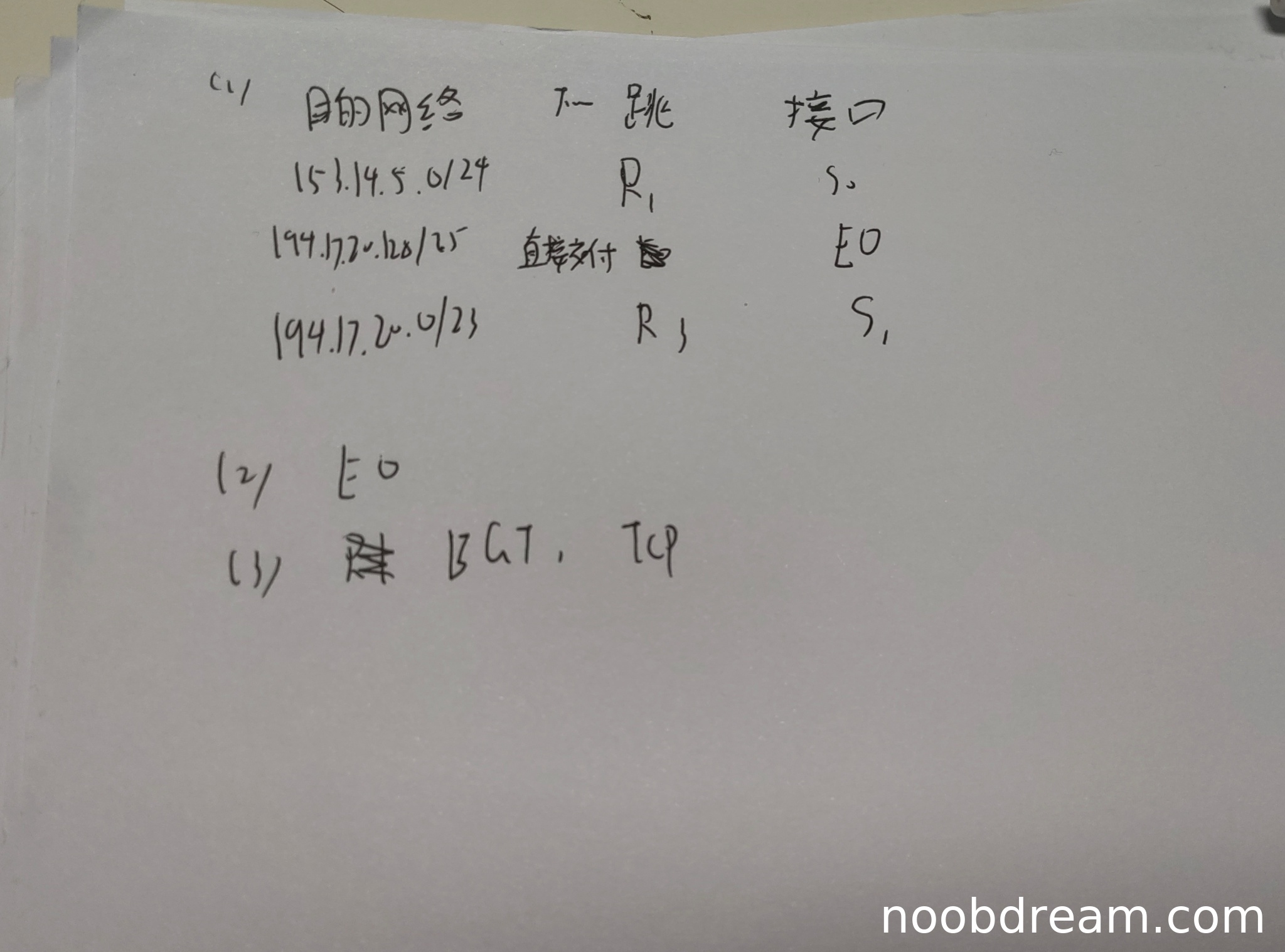 - 第三项:目的网络194.17.20.0/23,下一跳R3,接口S1。标准答案为194.17.20.0/23、194.17.24.2、S1。学生下一跳写为R3(应为IP地址),但R3是路由器标识,在上下文中可理解,接口正确,故此项基本正确,扣0.5分(下一跳未写IP地址)。得1.5分。