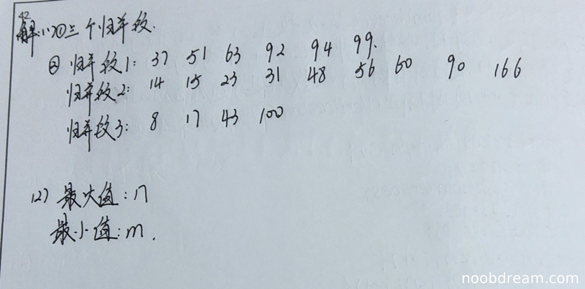 学生两次识别结果中最大值分别回答"17"和"17",最小值分别回答"m"和"8"。标准答案为最大值n,最小值m。学生回答的最大值17明显错误(17是具体数值而非理论最大值),最小值回答"m"正确但"8"错误。由于存在逻辑错误,扣1分,得1分。