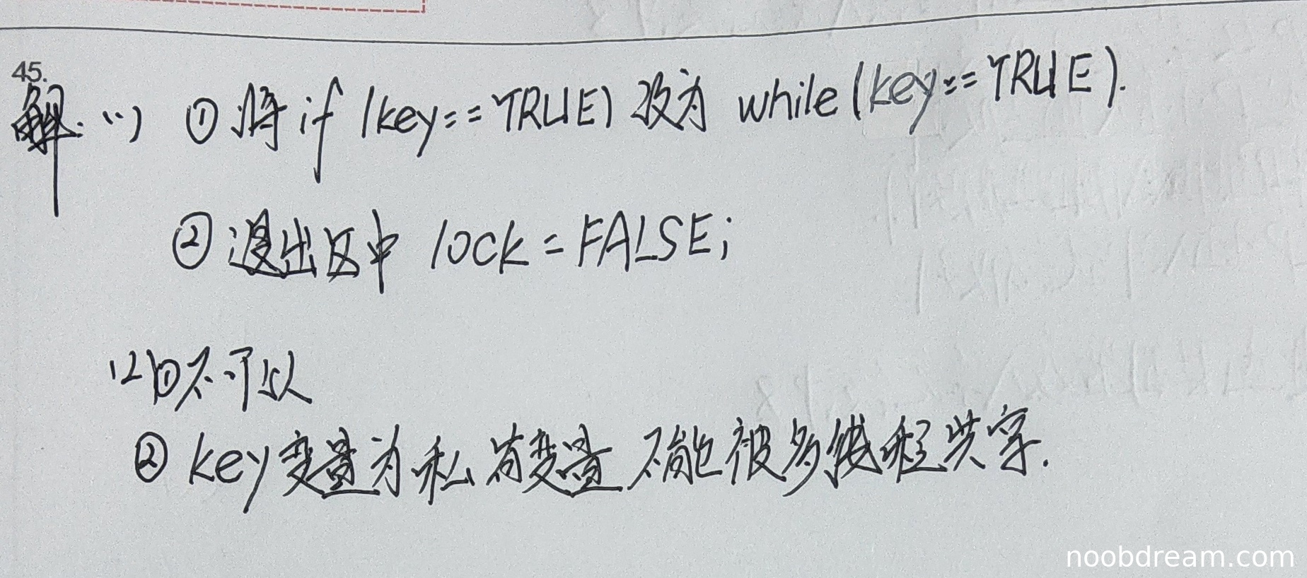 标准答案的核心问题是newSwap()函数不是原子操作,而学生只提到了key是私有变量这一事实,但私有变量本身并不是不能使用newSwap()的原因。学生没有指出关键问题——newSwap()函数缺乏原子性,可能导致并发执行时多个线程同时进入临界区。因此扣2分,得1分。