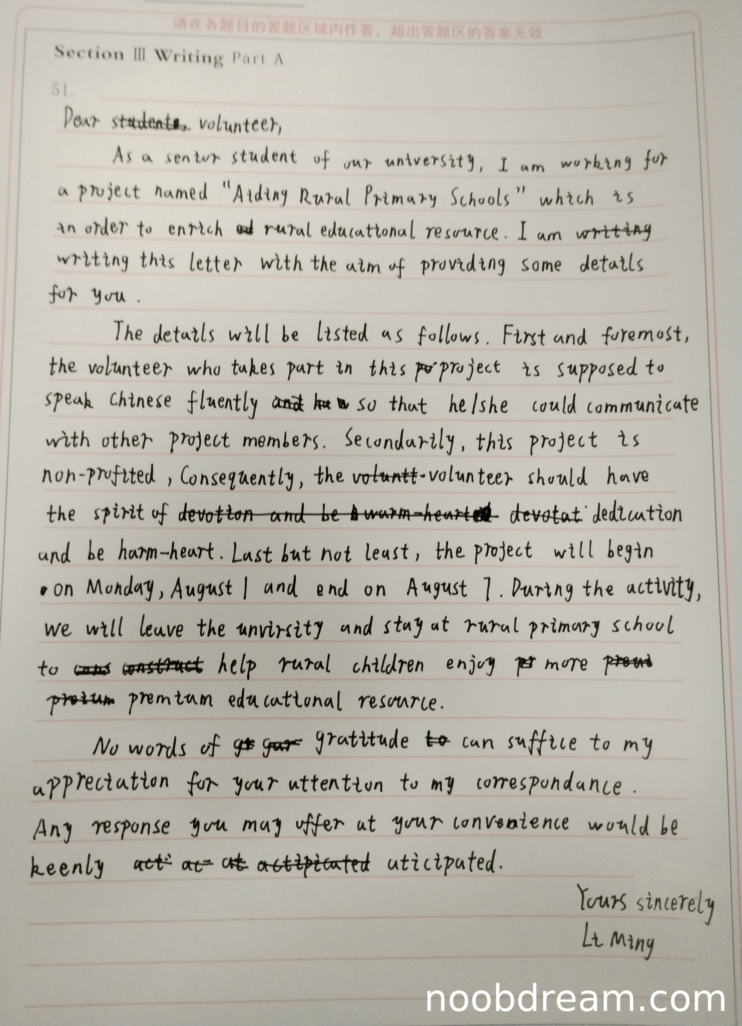 理由:题目要求回复国际志愿者的询问,详细说明项目细节。学生作答包含了项目目的(丰富农村教育资源)、志愿者要求(中文流利、有奉献精神)、项目时间(8月1日至7日)和活动内容(前往农村小学帮助儿童)。但内容存在以下问题:1)称呼不当,使用"Dear students, volunteer(s)"不符合给单个国际志愿者回信的语境;2)部分细节如具体工作内容描述不够充分;3)结尾过度期待回复,不符合项目组织者身份。这些影响了内容的完整性和针对性。