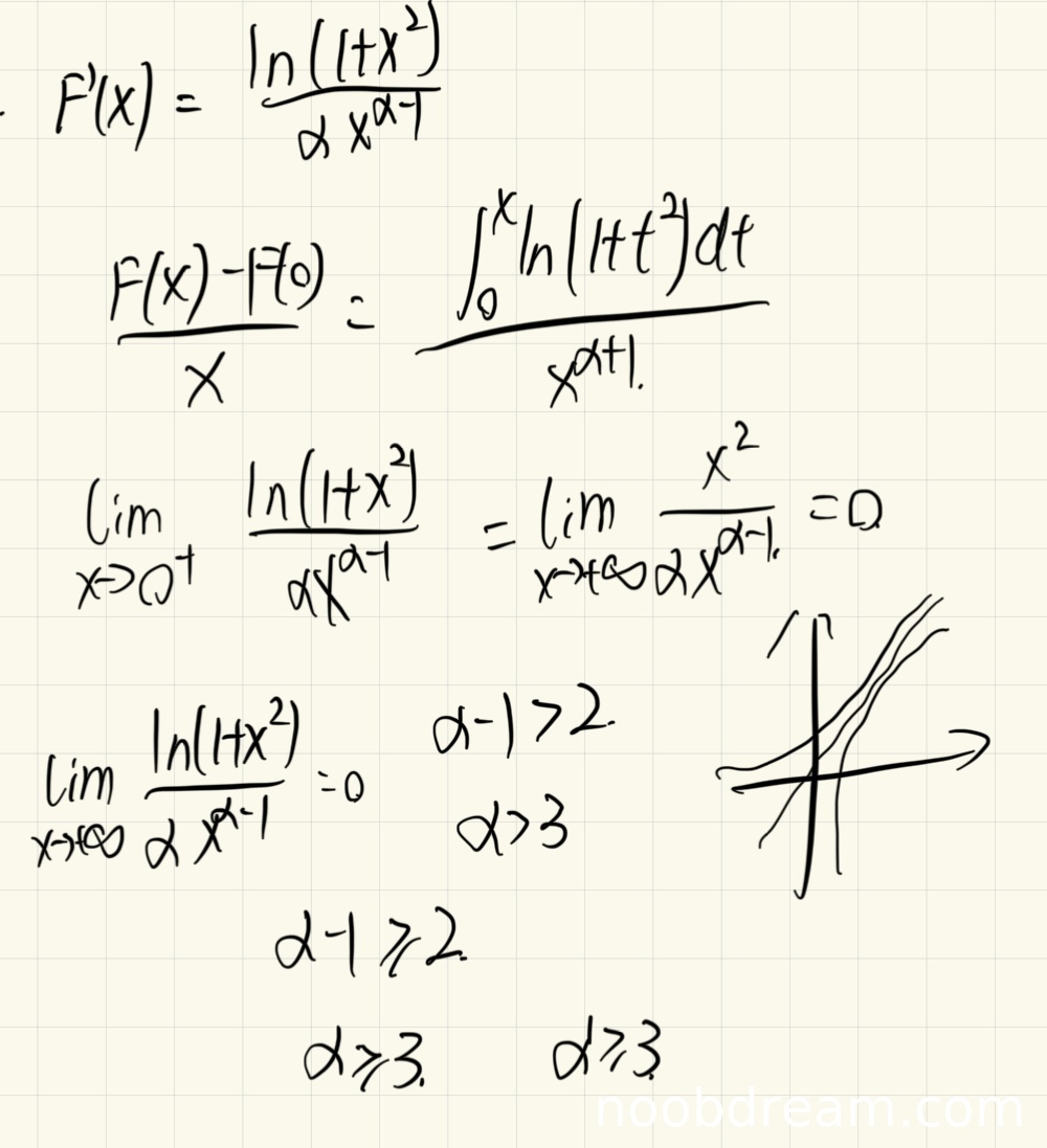 - 学生错误地计算了 \( F'(x) \),正确应为 \( F'(x) = \frac{\ln(1 + x^2) \cdot x^{3a} - \int_0^x \ln(1 + t^2) dt \cdot 3a x^{3a-1}}{x^{6a}} \),但学生给出的 \( F'(x) \) 形式错误,且后续推导基于此错误表达式。