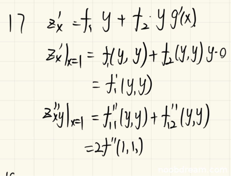 - 二阶混合偏导计算错误:学生计算 \( z_{xy}''|_{x=1} = f_{11}''(y,y) + f_{12}''(y,y) \),但正确应为 \( f_1' + y f_{11}'' + y f_{12}'' g(x) \) 在 \( x=1, y=1 \) 处的值,由于 \( g'(1)=0 \),简化后应为 \( f_1'(1,1) + f_{11}''(1,1) \)。学生漏掉了 \( f_1' \) 项,并且错误地将结果写为 \( 2f''(1,1,1) \),符号混乱。