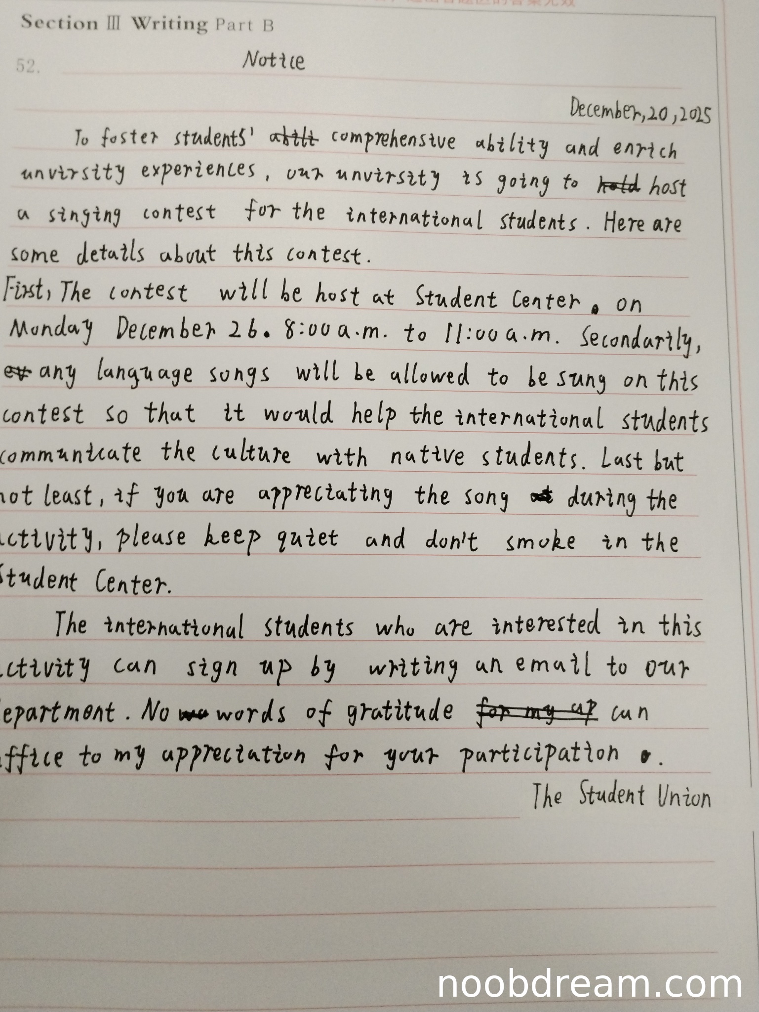 理由:格式基本正确,有日期、标题和落款,但语域不够恰当。结尾感谢语过于正式且表达不自然,与通知的简洁性要求不符。部分表达过于口语化,未能保持通知应有的正式但不过分拘谨的语域。