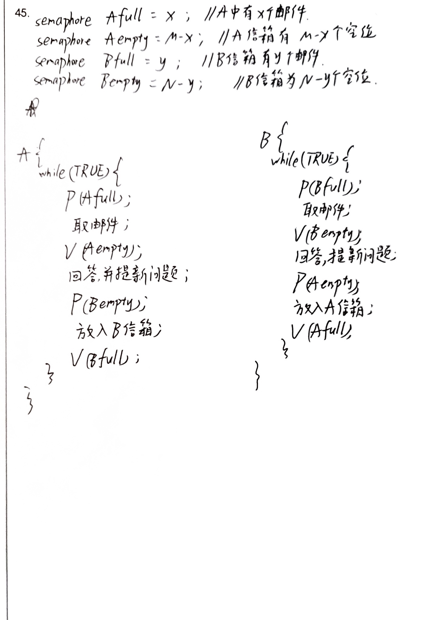 理由:学生对同步信号量的P、V操作使用正确。在取邮件前P(Full),取完后V(Empty);在放邮件前P(Empty),放完后V(Full)。操作顺序和位置都与标准答案一致,确保了正确的同步逻辑。