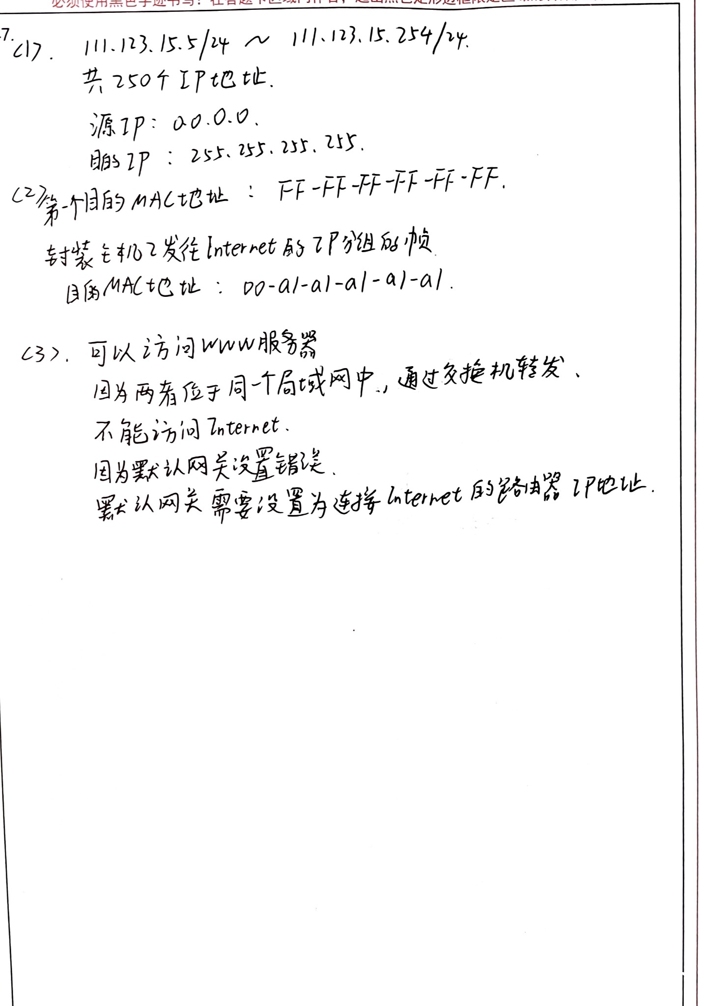 学生答案正确指出了DHCP地址分配范围为111.123.15.5~111.123.15.254(虽然标注了/24但不影响核心答案),DHCP Discover报文的源IP为0.0.0.0,目的IP为255.255.255.255,与标准答案完全一致。其中"7. (17)"可能是识别错误,但根据上下文可判断为误写,不影响得分。因此本小题得3分。