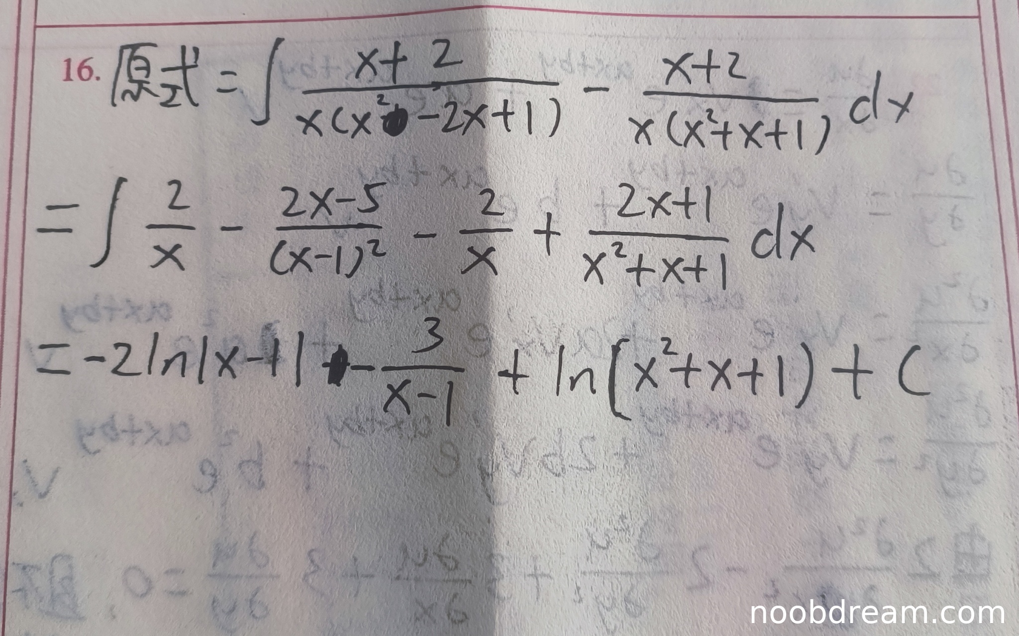 第二次识别结果中,详细展示了部分分式分解和积分过程,最终答案为 \(-2\ln|x - 1|-\frac{3}{x - 1}+\ln(x^{2}+x + 1)+C\),与标准答案完全一致。虽然第一次识别有误,但根据打分要求第3条“对学生作答进行了两次识别,只要其中有一次回答正确则不扣分”,且第二次识别正确,因此不扣分。
