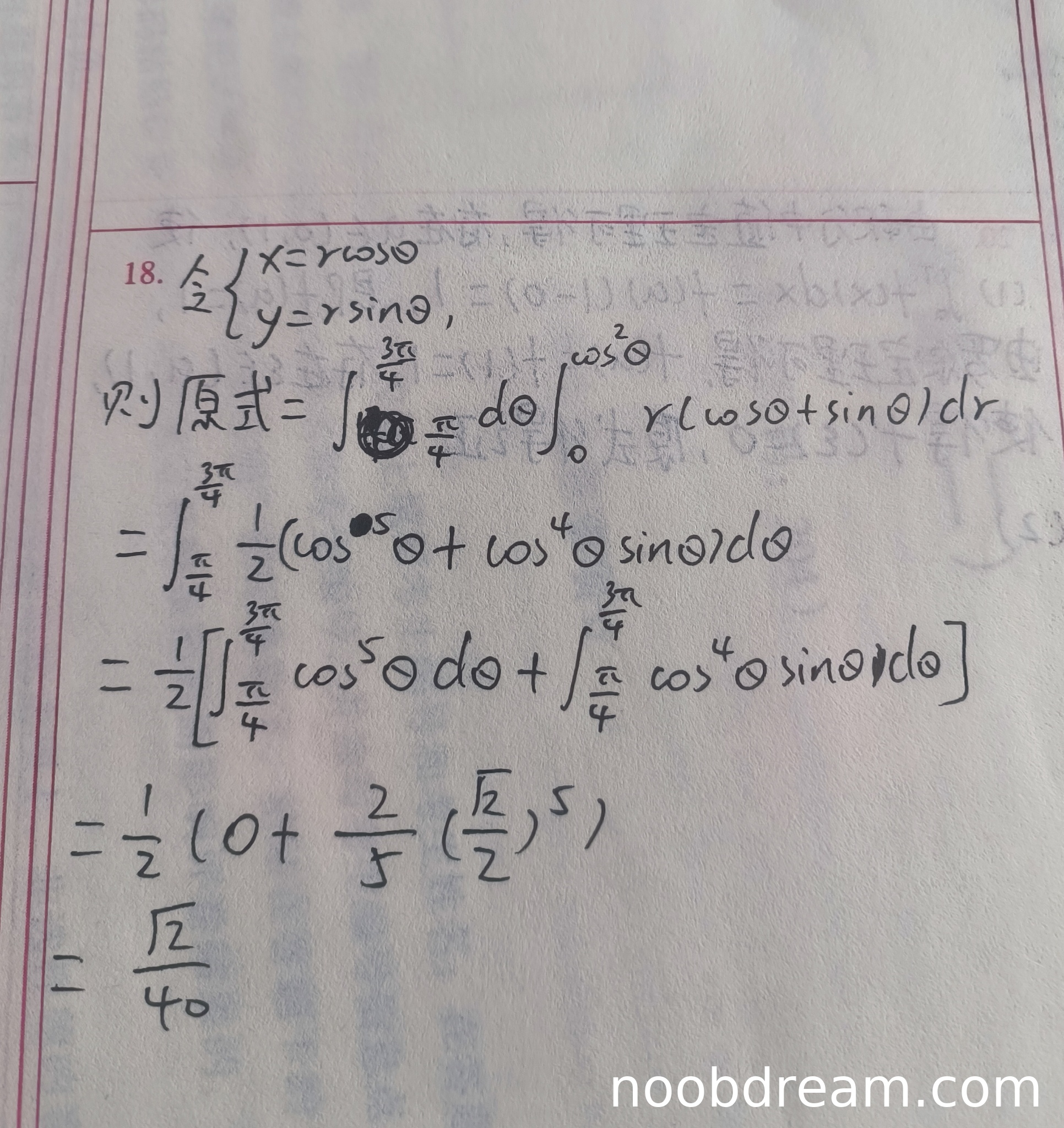 由于第一步的积分限错误,导致后续计算全部错误。虽然计算过程中的积分技巧(如换元法)使用正确,但由于基础错误,最终结果错误。标准答案是43√2/120,而学生得到的是√2/40。得1分。
