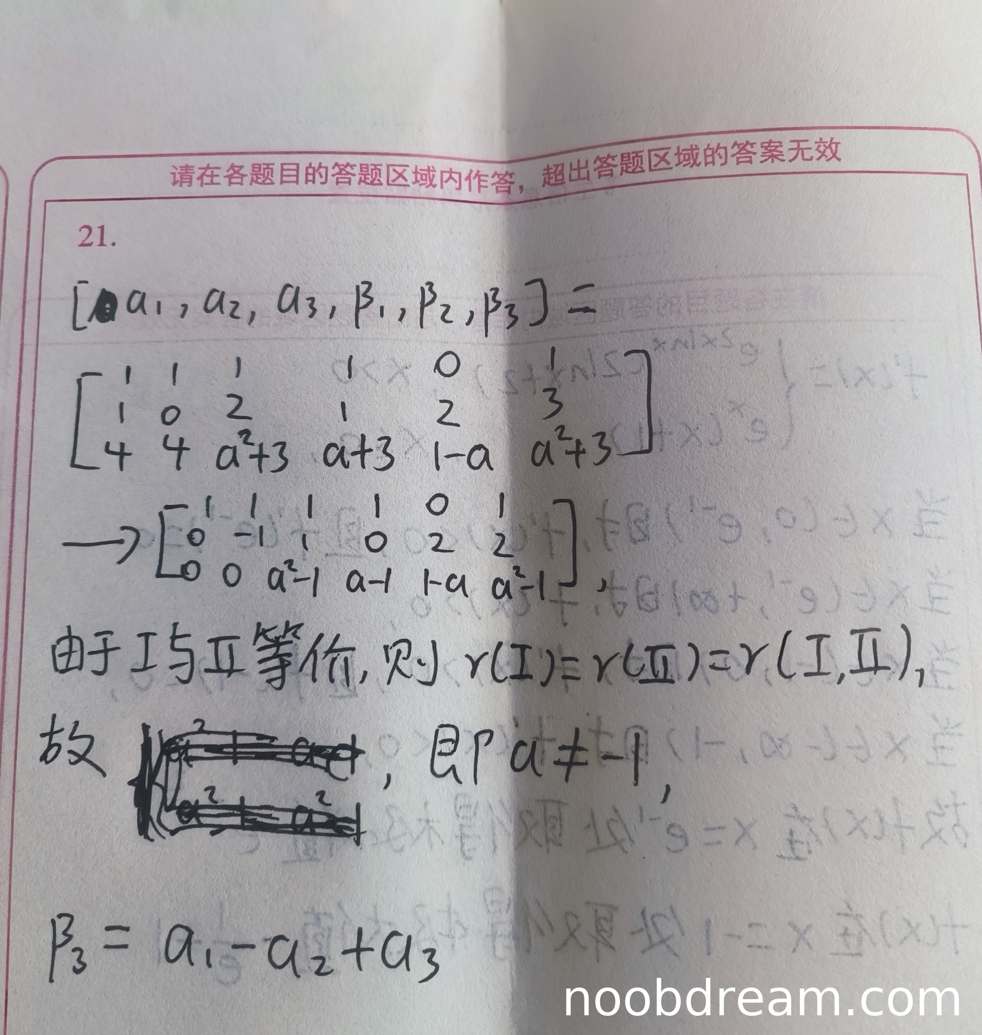 学生直接给出 \(\beta_3 = \alpha_1 - \alpha_2 + \alpha_3\),这是 \(a \neq \pm 1\) 时的正确表达式。但未讨论 \(a = 1\) 时的特殊情况(此时表示不唯一),而标准答案要求对 \(a = 1\) 和 \(a \neq \pm 1\) 分别讨论。因此,该部分答案不完整,扣3分。得分:3分。