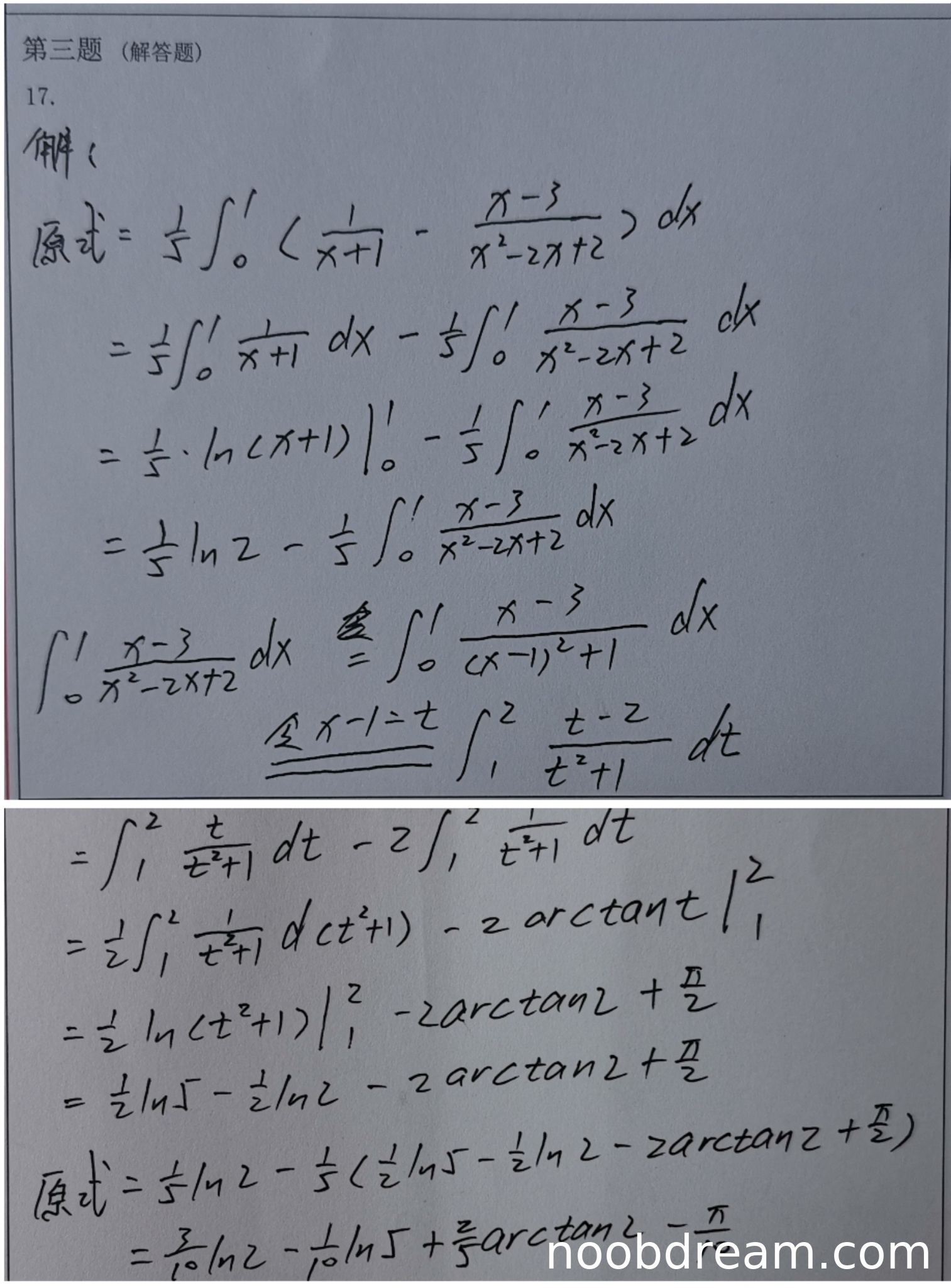 - 逻辑错误3:最终结果\(\frac{1}{2}\ln2+\frac{\pi}{2}\)与标准答案\(\frac{3}{10}\ln2+\frac{1}{10}\pi\)完全不同