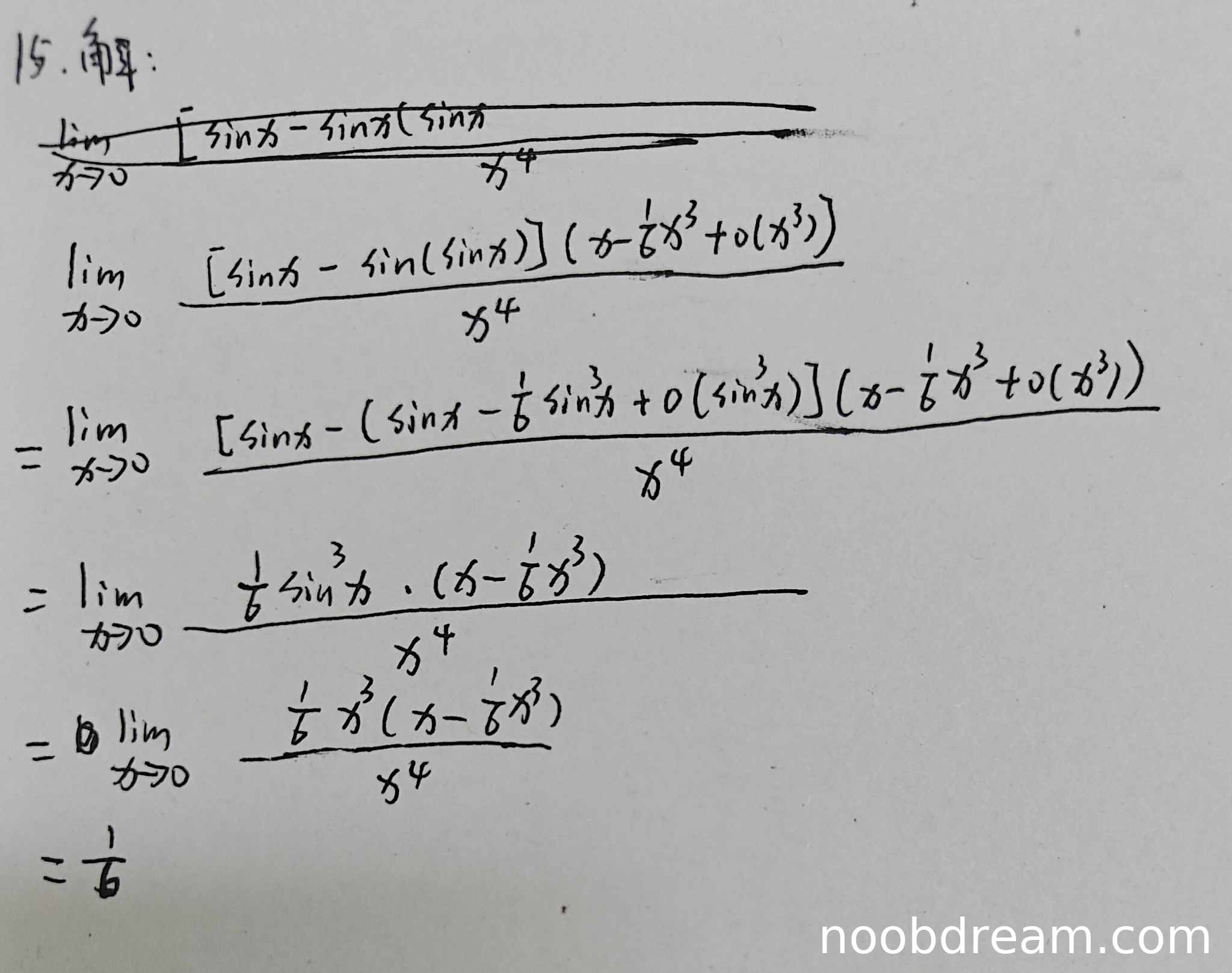 学生作答使用了泰勒展开的方法,思路正确,与标准答案不同但可行。在第一次识别中,原式写为 \(\lim_{x \to 0} \frac{[\sin x - \sin x(\sin x}{x^4}\) 存在识别错误(括号不匹配),但后续步骤正确。第二次识别详细解释了泰勒展开过程,最终得到正确结果 \(\frac{1}{6}\)。但在第二步中,学生写为 \(\lim_{x\rightarrow0}\frac{\frac{1}{6}\sin^{3}x\cdot(x - \frac{1}{6}x^{3})}{x^{4}}\),这里多乘了 \((x - \frac{1}{6}x^{3})\),是逻辑错误,导致后续计算复杂化,但最终极限值正确。由于核心思路正确且结果正确,但存在一步不必要的乘法,扣1分。
