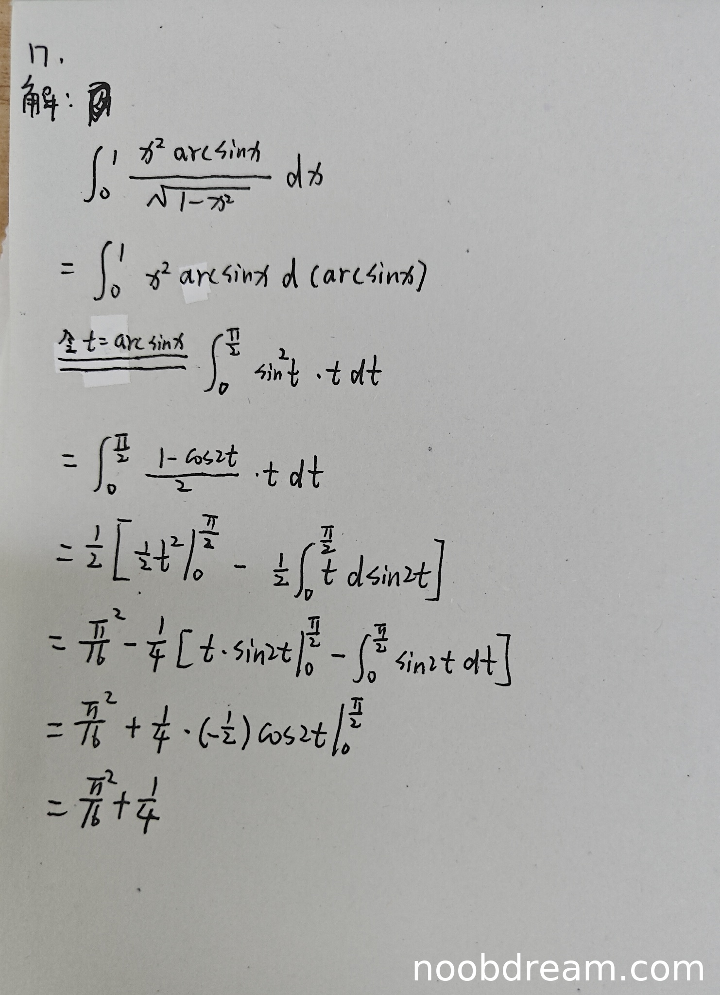 - 换元步骤正确:令 \( t = \arcsin x \),将积分转化为 \( \int_{0}^{\frac{\pi}{2}} \sin^2 t \cdot t \, dt \),与标准答案一致。