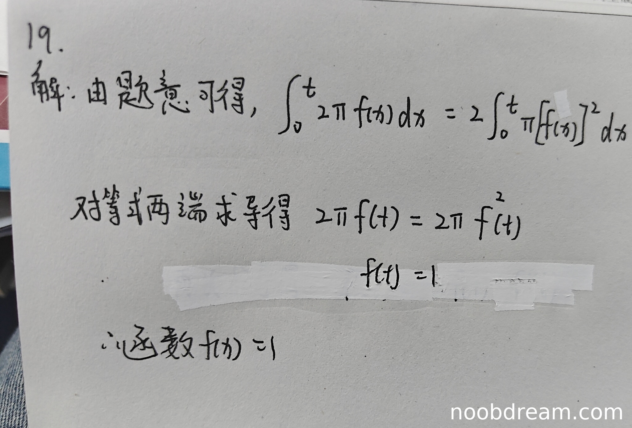 学生作答中,旋转体侧面积公式写错,误写为 \( \int_{0}^{t} 2\pi f(x) \, dx \)(应为 \( 2\pi \int_{0}^{t} f(x) \sqrt{1+[f'(x)]^2} \, dx \)),导致后续推导错误。虽然思路是建立侧面积等于2倍体积的方程并求导,但关键公式错误属于逻辑错误。最终得出 \( f(x) = 1 \) 不符合题意(不满足 \( f(0)=1 \) 以外的条件)。根据标准答案,正确结果应为 \( f(x) = \cosh x \)。因此,扣除主要逻辑错误分,仅给予基础思路分。得分:2分(满分10分)。