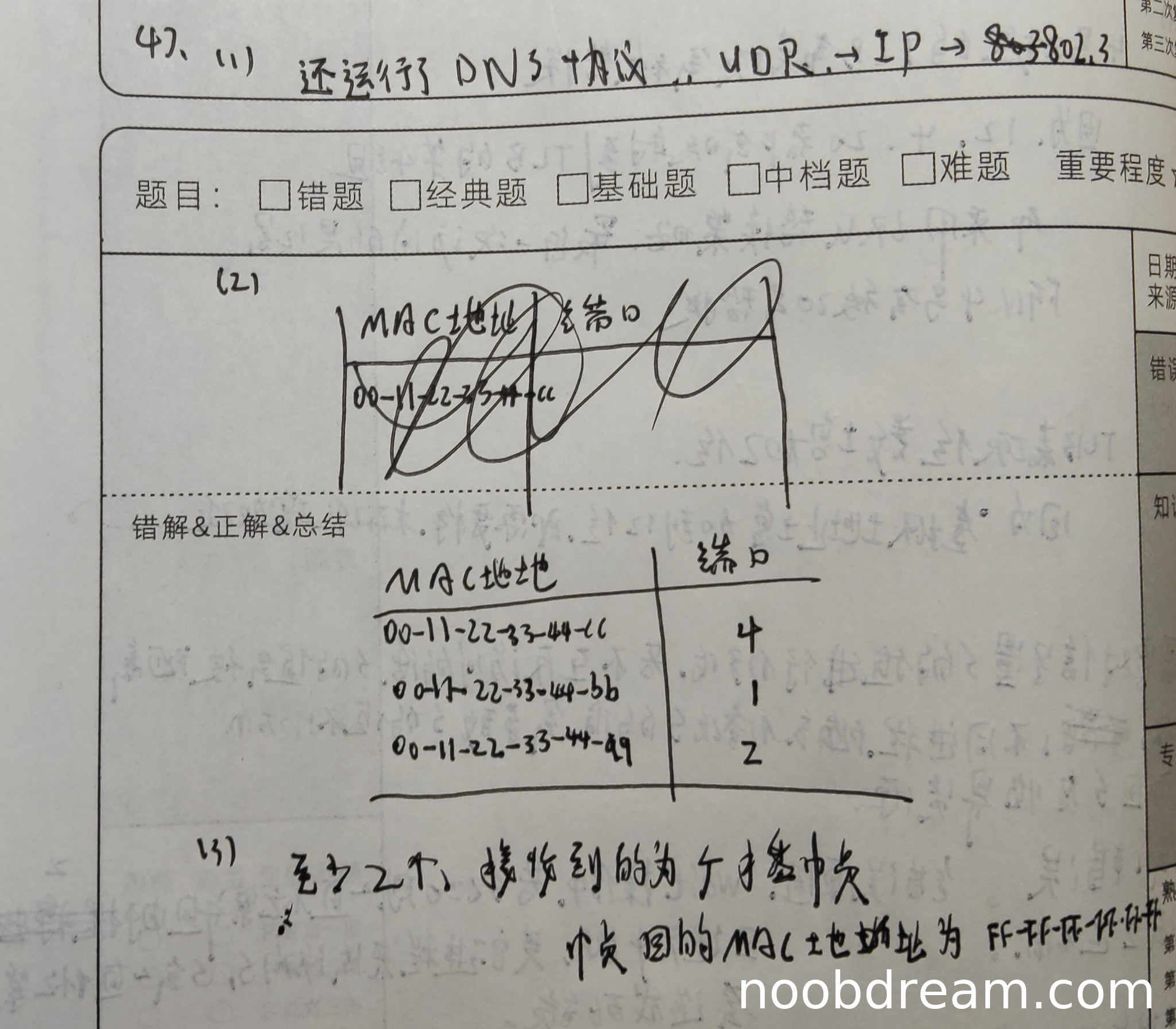 学生列出了正确的MAC地址表项,但端口号全部缺失。虽然MAC地址正确,但端口信息是交换表的重要组成部分,缺失端口信息导致答案不完整。扣2分。得1分。