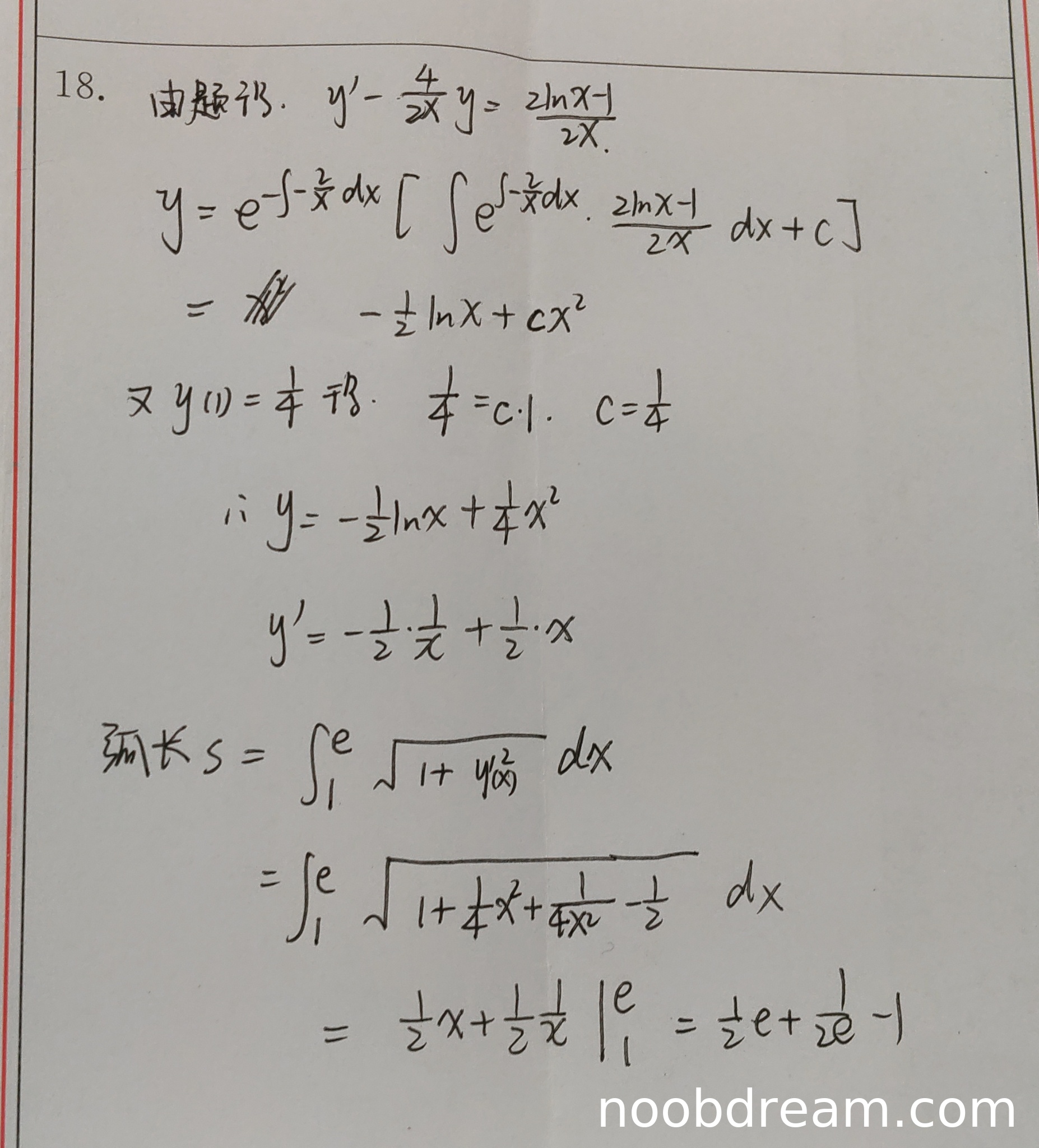 学生正确应用了弧长公式 \(s = \int_{1}^{e} \sqrt{1 + y'^{2}} dx\)。在计算 \(1 + y'^{2}\) 时,学生得到的结果为 \(\left(\frac{1}{2x} + \frac{1}{2}x\right)^{2}\),这与标准答案中的 \(\frac{1}{4}\left(x + \frac{1}{x}\right)^{2}\) 等价。然而,在最后的积分计算中,学生得到的结果为 \(\frac{1}{2}e + \frac{1}{2e} - 1\),这与标准答案 \(\frac{e^{2} + 1}{4}\) 不相等。通过数值验证,\(\frac{1}{2}e + \frac{1}{2e} - 1 \approx 0.543\),而 \(\frac{e^{2} + 1}{4} \approx 2.097\),明显不同。学生在积分计算步骤中出现错误:\(\frac{1}{2}\int_{1}^{e}\frac{1}{x}dx + \frac{1}{2}\int_{1}^{e}xdx = \frac{1}{2}\ln x\big|_{1}^{e} + \frac{1}{2}\cdot\frac{1}{2}x^{2}\big|_{1}^{e} = \frac{1}{2}(1) ...