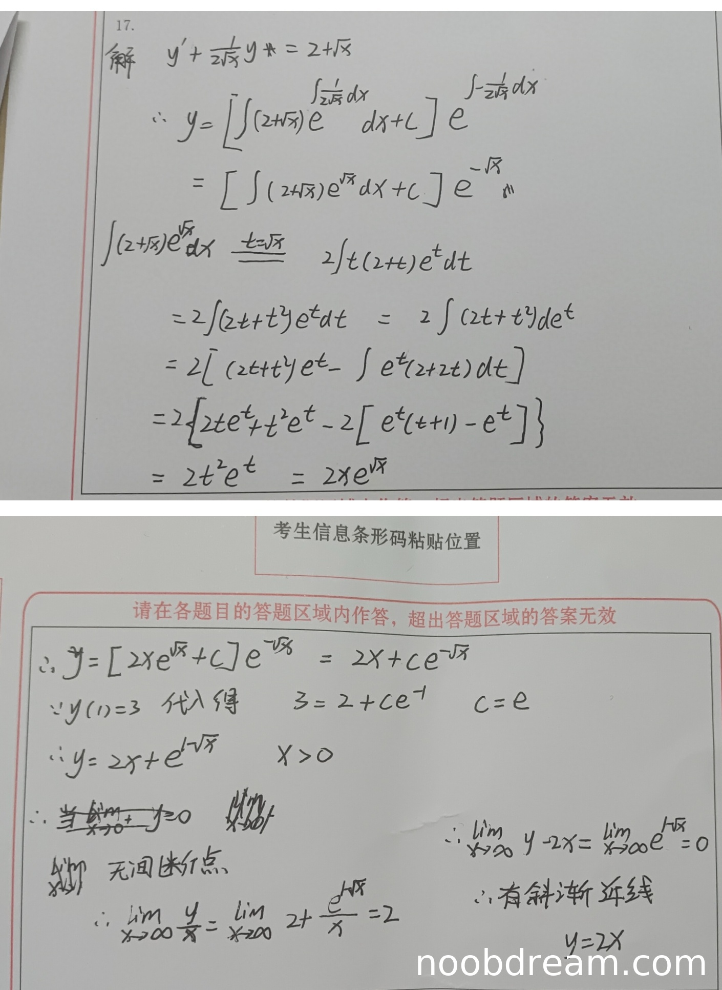 但在第一次识别结果中,计算 \(b\) 时写成了 \(\lim_{x\to\infty} e^{\sqrt{x}}\)(应为 \(e^{1-\sqrt{x}}\)),这是明显的计算错误。不过第二次识别结果中已修正为正确表达式 \(\lim_{x\to+\infty}e^{1-\sqrt{x}}=0\)。根据评分规则"对学生作答进行了两次识别,只要其中有一次回答正确则不扣分",此错误不扣分。渐近线分析部分得满分6分。
