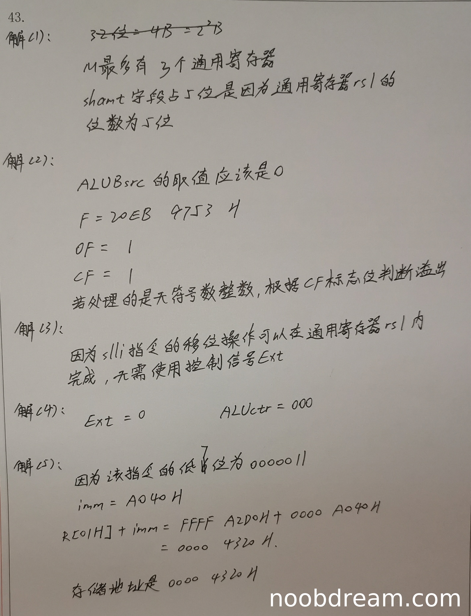 ALUBsrc取值正确(0)得1分;F计算结果错误(应为1FDB9753H)扣1分;OF和CF结果正确各得0.5分;无符号整数溢出判断依据CF正确得0.5分。本小题共得2分。