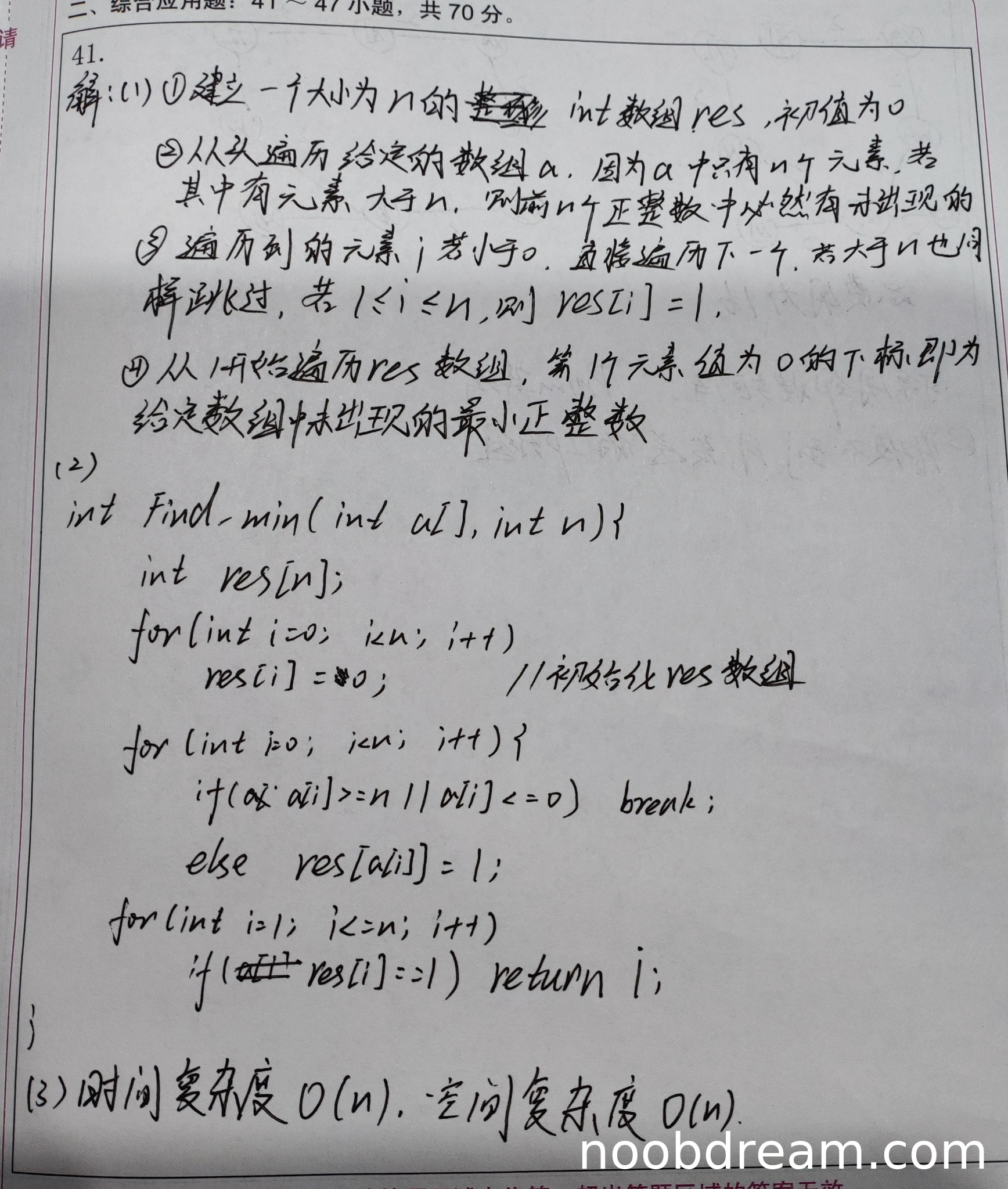 学生答案的基本设计思想是:使用一个辅助数组res来标记1到n范围内的正整数是否出现。思路正确,与标准答案的哈希思想类似,但实现方式不同。该思路能够解决问题,因此不扣分。得3分。