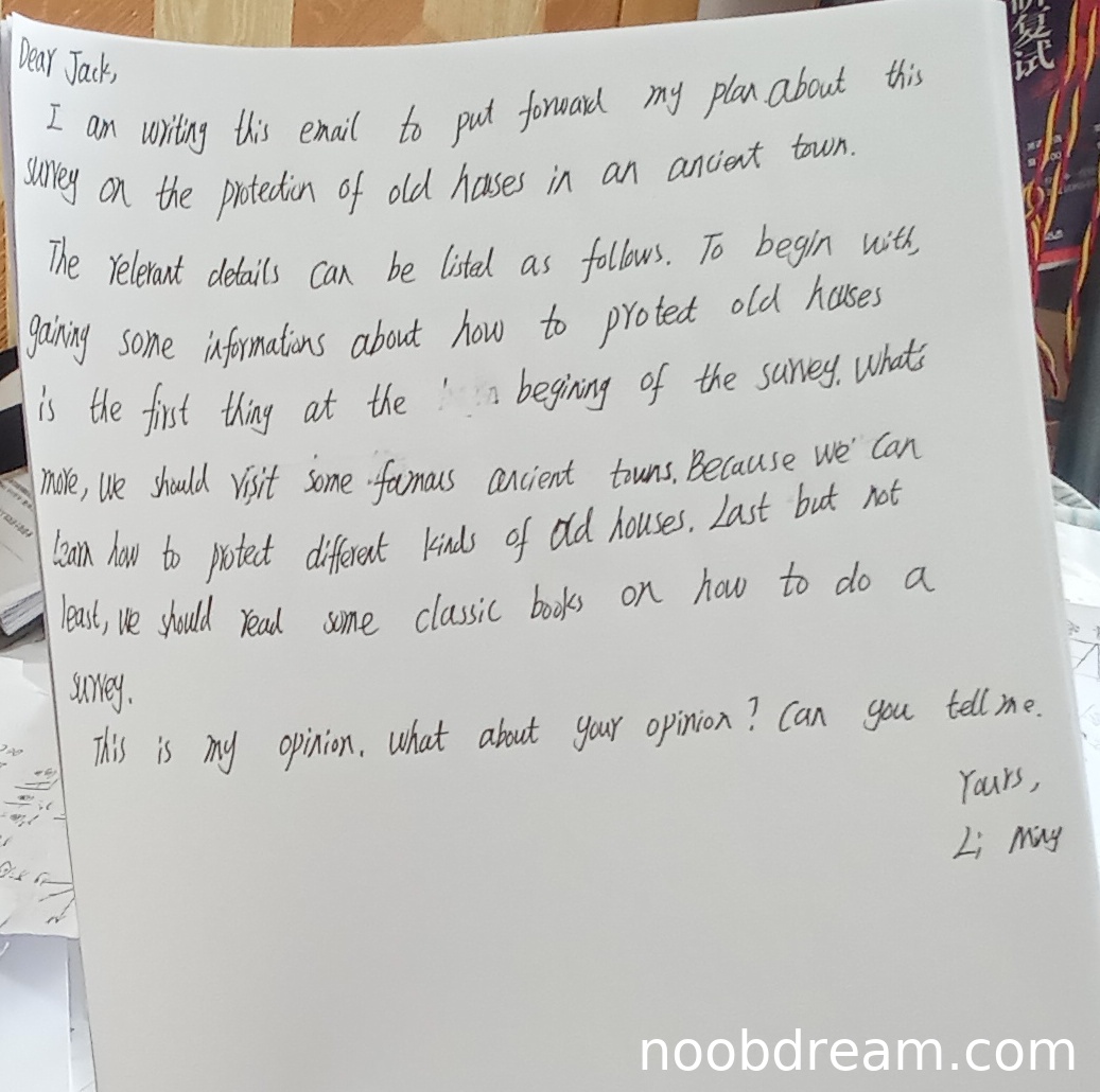 理由:邮件格式基本正确,有称呼、正文、结束语和签名。但语域不够恰当,部分表达过于口语化(如"Can you tell me"),与正式的书信交流有一定差距。