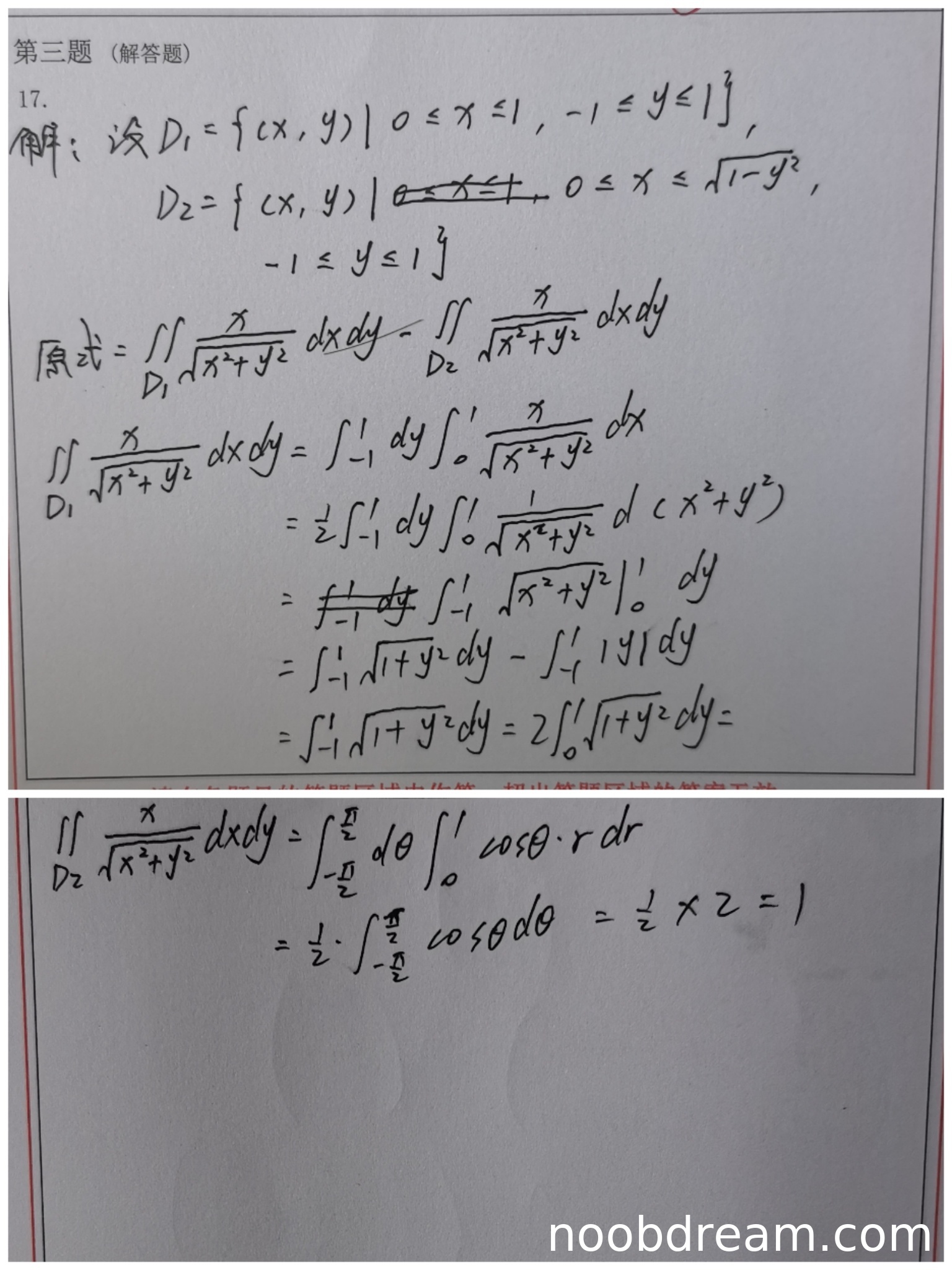 学生作答的整体思路是正确的:将原积分区域D拆分为D1(矩形区域)和D2(四分之一圆区域),然后分别计算两个二重积分并相减。这种方法与标准答案不同但正确,因此不扣分。