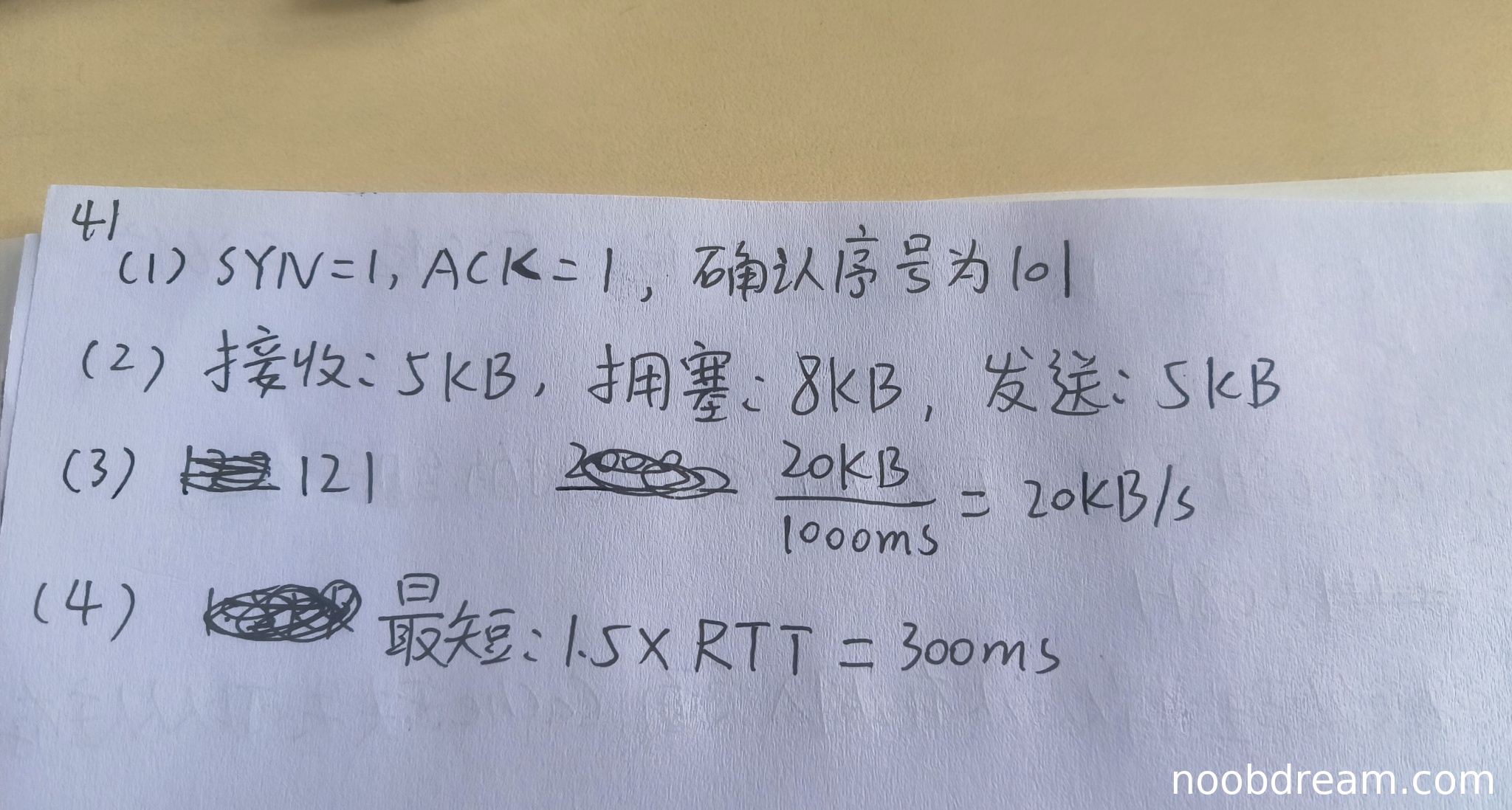 学生答案:接收窗口=5KB,拥塞窗口=8KB,发送窗口=5KB。标准答案为:接收窗口=12KB,拥塞窗口=9KB,发送窗口=9KB。学生答案在接收窗口、拥塞窗口和发送窗口的计算上均存在逻辑错误。根据TCP接收缓存动态变化和拥塞控制算法(慢启动阶段),第8个确认段对应的接收窗口应为12KB,拥塞窗口应为9KB,发送窗口取min(拥塞窗口, 接收窗口)=9KB。学生答案三项均错误,扣3分。得0分。