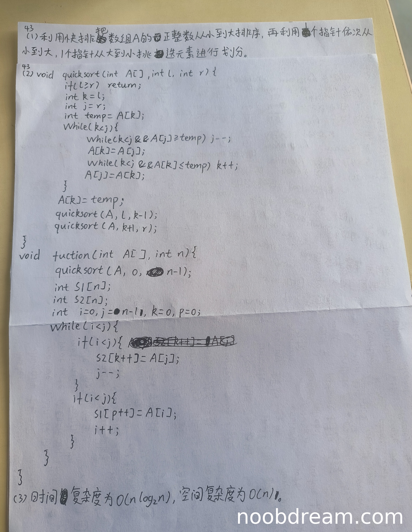 理由:学生正确分析了算法的时间复杂度O(n log₂n)和空间复杂度O(n),但这不是最优解。标准答案的时间复杂度是O(n),空间复杂度是O(1)。学生的分析虽然正确,但没有达到题目要求的"尽可能高效"。