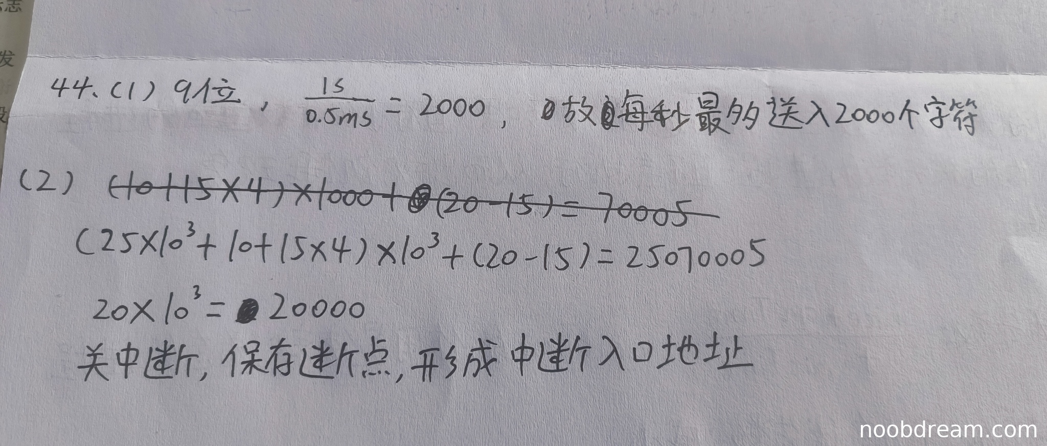 - 第二行计算:$(25×10^{3}+10 + 15×4)×10^{3}+(20 - 15)=25070005$,这是完成1000个字符的总时间,但标准答案为$1000×25070=25070000$,学生计算过程有误(如$25×10^3$应为$2.5×10^4$),但结果接近,扣1分。