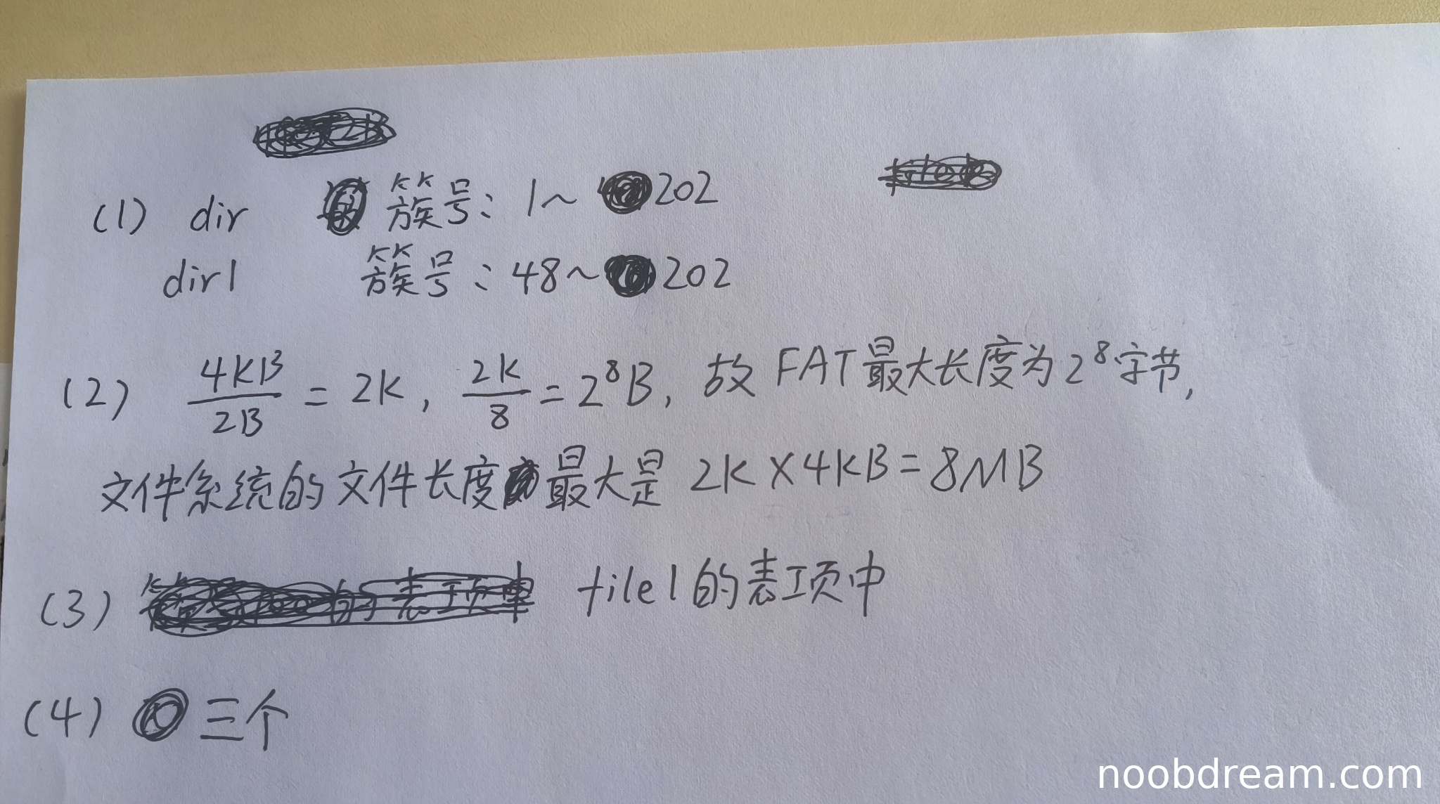 学生计算过程存在多处错误:首先FAT表项占2字节,最大簇号应为2^16=65536,但学生计算为2K=2048;其次FAT最大长度计算错误,应为65536×2B=128KB,学生得到2^8=256字节;最后文件最大长度计算也错误,应为65536×4KB=256MB,学生得到8MB。这些都属于核心逻辑错误,因此得0分。